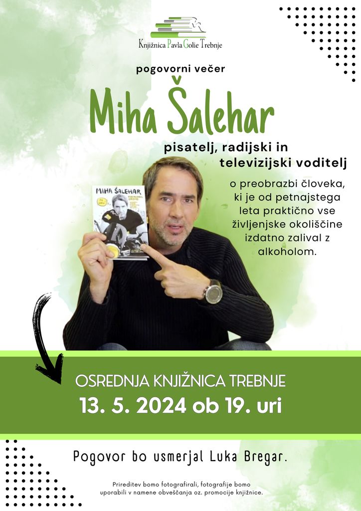 V ponedeljek, 13. maja 2024, ob 19:00 vabljeni v Osrednjo knjižnico Trebnje na pogovorni večer z Miho Šaleharjem. Pogovor s pisateljem, kolumnistom, radijskim in televizijskim voditeljem bo usmerjam Luka Bregar.