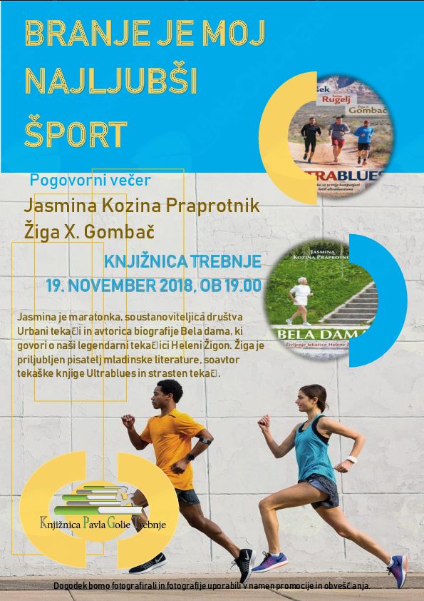 Vabimo, da se nam pridružite pri pogovoru z Jasmino Kozina Praprotnik in Žigo X. Gombačem. Jasmina je maratonka, soustanoviteljica društva Urbani tekači, avtorica biografije Bela dama, ki govori o naši legendarni tekačici Heleni Žigon. Žiga je priljubljen pisatelj mladinske literature, soavtor tekaške knjige Ultrablues in strasten tekač.