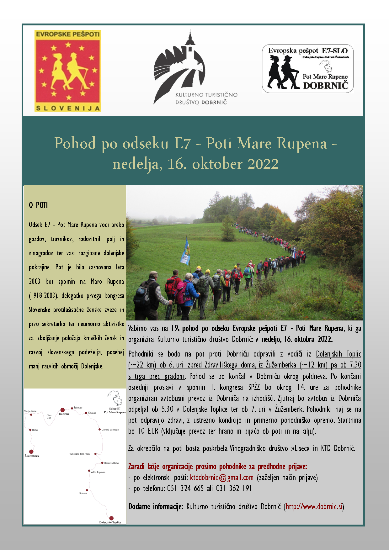 Vabimo vas na 19. pohod po odseku Evropske pešpoti E7 - Poti Mare Rupena, ki ga organizira Kulturno turistično društvo Dobrnič: v nedeljo, 16. oktobra 2022.
