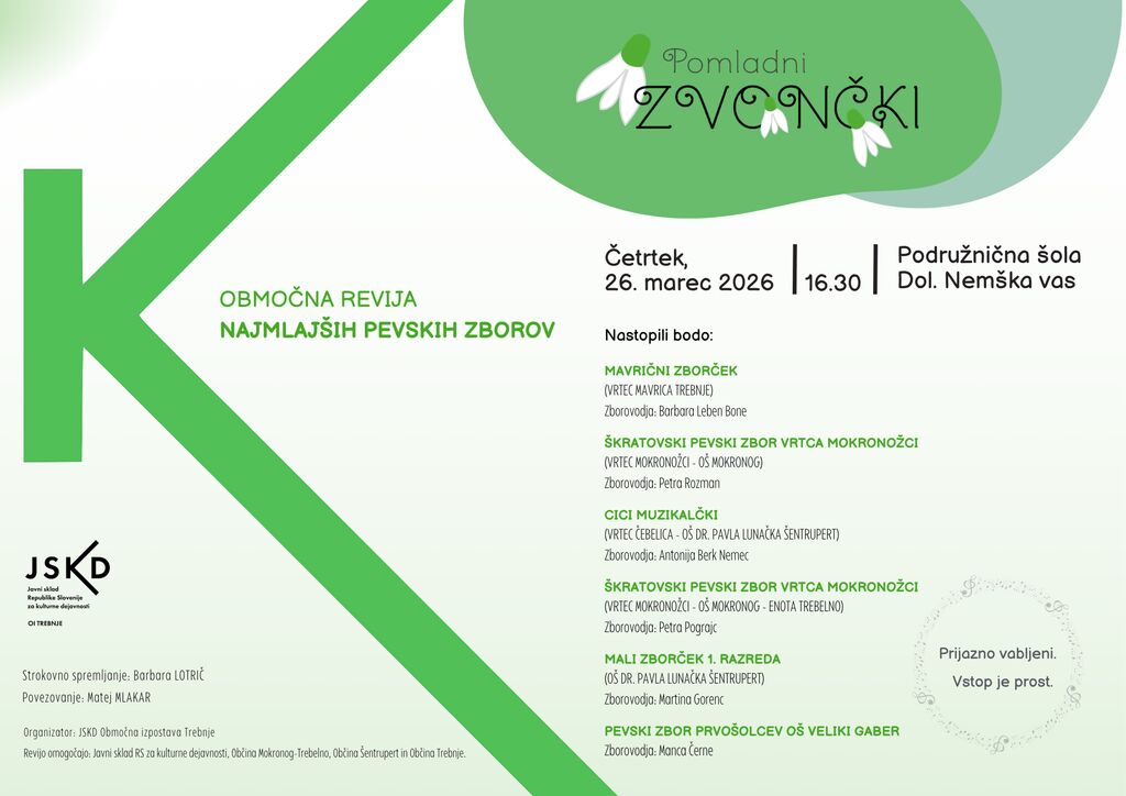Prisrčno vabljeni na Območno revijo najmlajših pevskih zborov Pomladni zvončki, ki se bo odvila v četrtek, 26. marca 2026, ob 16.30 v Športni dvorani PŠ Dolenja Nemška vas.