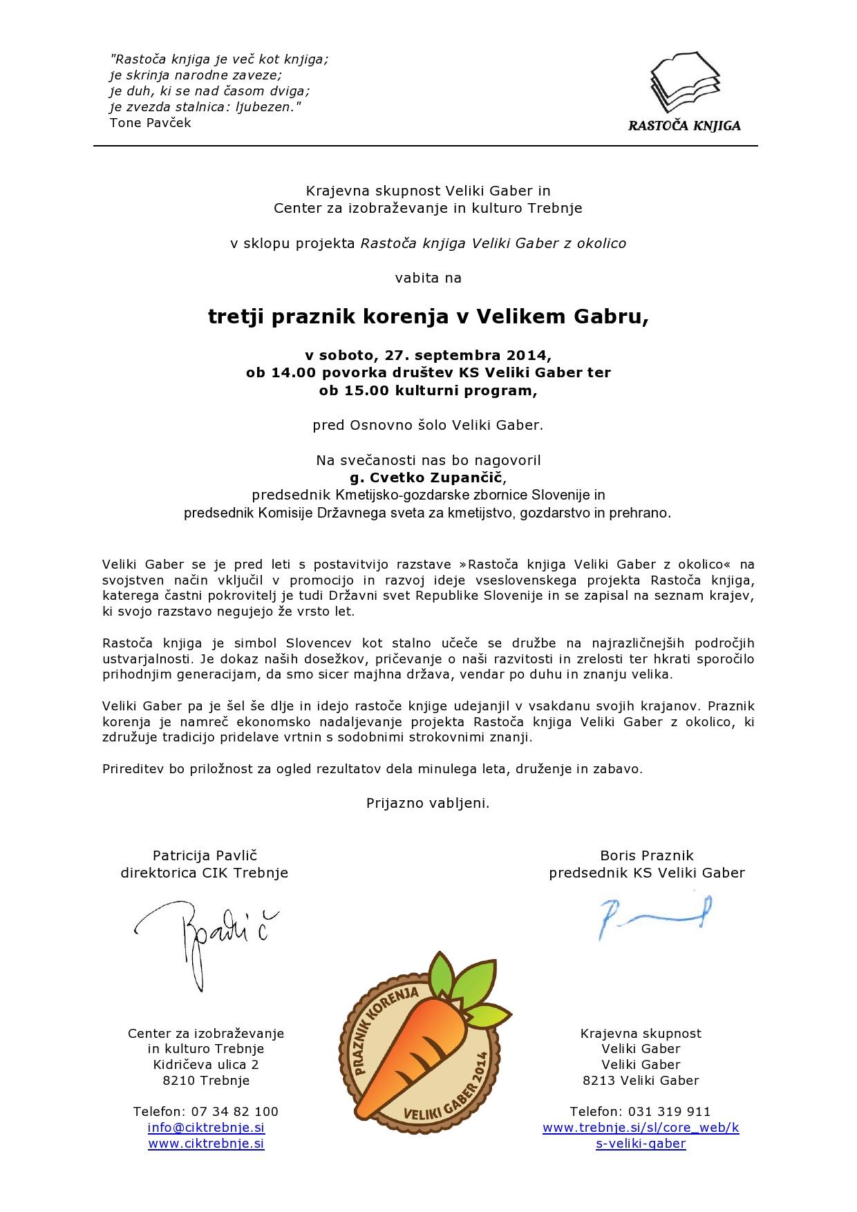 Letos bo v Velikem Gabru potekal 3. praznik korenja. Tekom vikenda se bo zvrstil zanimiv kulturni, zabavni in športni program, na stojnicah pa vas čakajo dobrote društev iz Velikega Gabra.