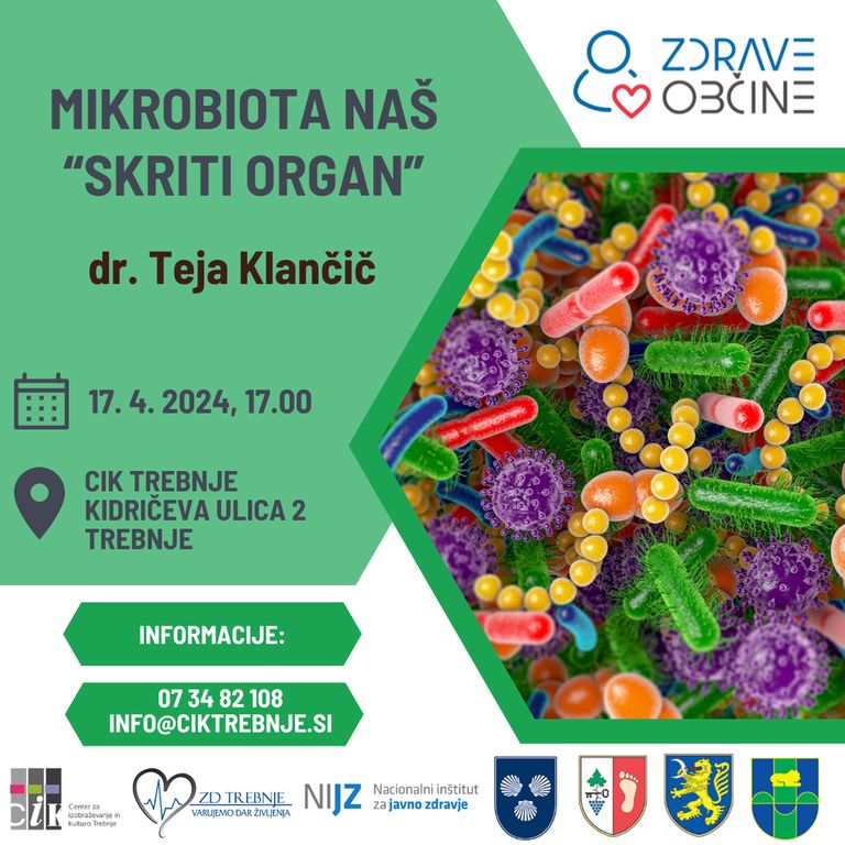 V okviru Svetovnega dneva zdravja 2024 vas vabimo na predavanje Mikrobiota naš »skriti organ«, v sredo, 17. 4. 2024, ob 17.00 na CIK Trebnje, Kidričeva ulica 2. Predavanje bo izvedla domačinka, dr. Teja Klančič.