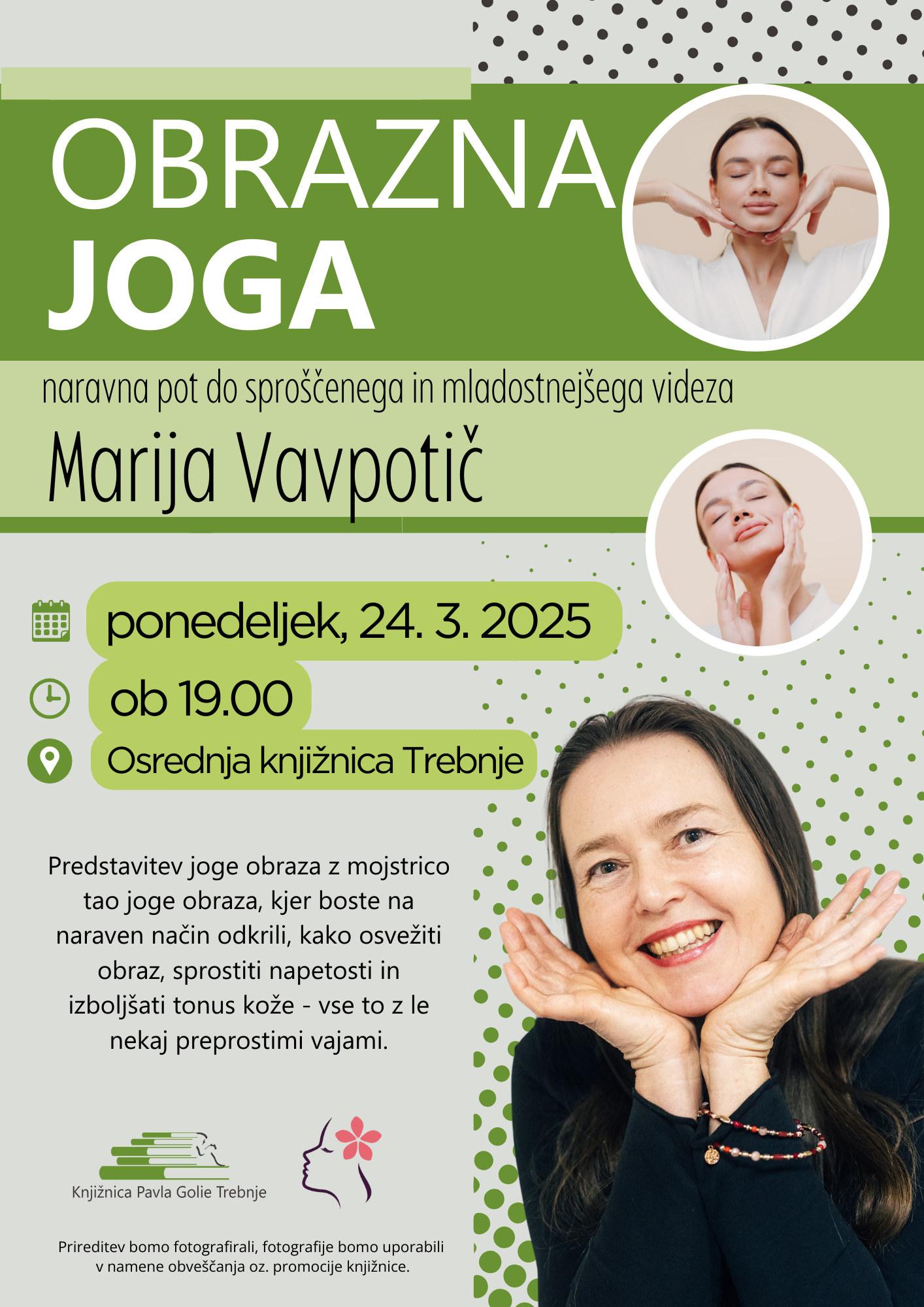 V ponedeljek, 24. 3. 2025, ob 19.00, vas vabimo v Osrednjo knjižnico Trebnje na predavanje Marije Vavpotič Obrazna joga.