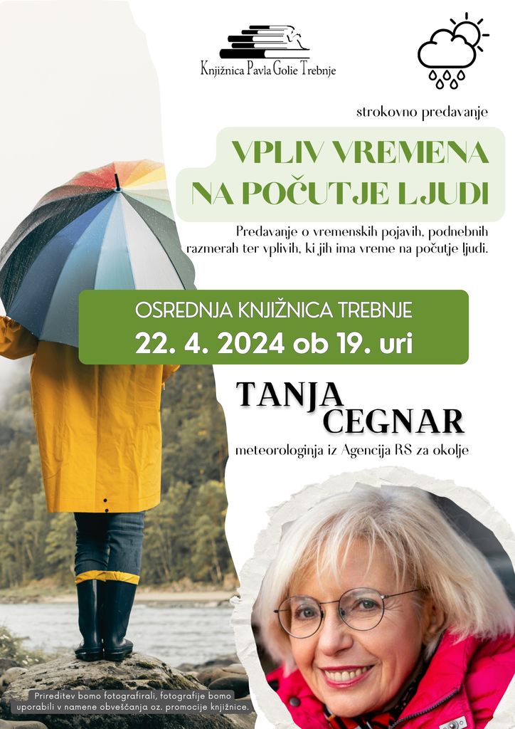 Odgovore na vsa vremenska vprašanja bomo dobili v ponedeljek, 22. 4. 2024, ob 19. uri, ko bomo v Osrednji knjižnici Trebnje, prisluhnili mag. Tanji Cegnar, meteorologinji in vremenarki nacionalne televizije, ki gledalce vedno pozdravi s prijaznim nasmeškom. Mag. Tanja Cegnar je tudi svetovalka generalnega direktorja za področje podnebnih sprememb, urednica biltena Naše okolje, opazovalka v Mednarodnem društvu za biometeorologijo in organizatorka strokovnih konferenc s področja meteorologije. Sama o vremenu pravi: “Vremena ne moremo spreminjati po lastnih željah in če se znamo pravilno prilagajati, potem lahko dobro shajamo ob vsakem vremenu. Sicer pa je največji čar vremena prav v tem, da se neprestano spreminja.”