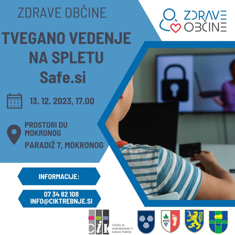 V okviru programa Zdrave občine vas vabimo na brezplačno predavanje Tvegano vedenje na spletu, v sredo, 15. decembra 2023, ob 17.00 v prostore Društva upokojencev Mokronog, Paradiž 7, Mokronog. Predavanje bo izvedla Eva Koprivec, zavod Safe.si. Na predavanje se lahko prijavite TUKAJ.