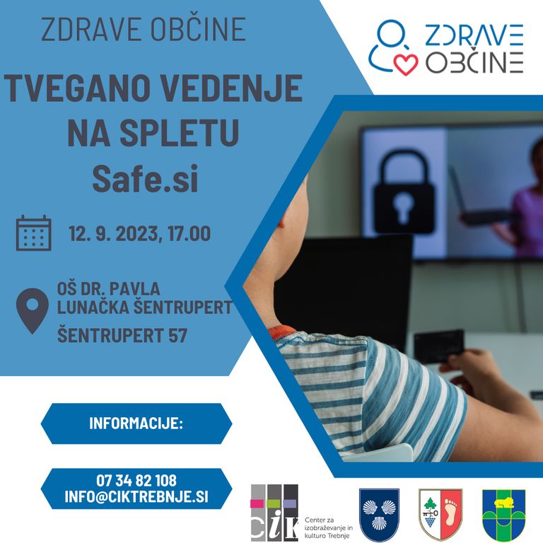 V okviru programa Zdrave občine vas vabimo na brezplačno predavanje Tvegano vedenje na spletu, v torek, 12. septembra 2023, ob 17.00 v večnamenski dvorani v mansardi OŠ dr. Pavla Lunačka Šentrupert, Šentrupert 57, Šentrupert. Predavanje bo izvedla Eva Koprivec, zavod Safe.si.