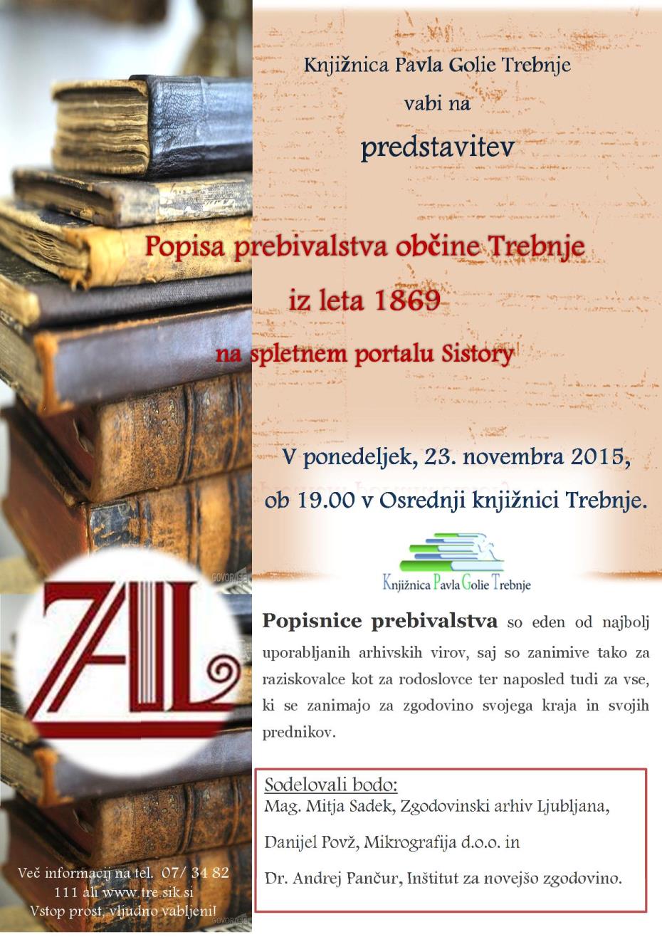 Vabljeni na predstavitev Popisa prebivalstva občine Trebnje iz leta 1869 na spletnem portalu Sistory v ponedeljek, 23. novembra 2015, ob 19.00 v Osrednji knjižnici Trebnje.