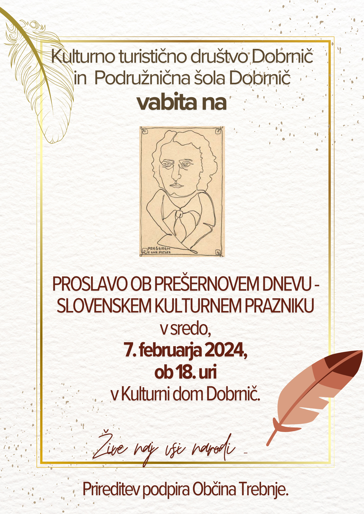 KTD Dobrnič in Podružnična šola Dobrnič vabita na tradicionalno obeležitev praznika slovenske kulture, v spomin na pesnika Franceta Prešerna. Proslava bo na predvečer praznika, v sredo, 7. februarja 2024, v Kulturnem domu Dobrnič ob 18. uri. Prešerno vabljeni!