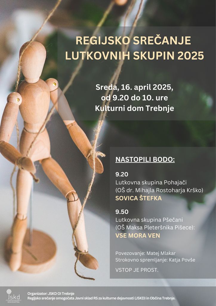 Vljudno vabljeni na Regijsko srečanje lutkovnih skupin 2025, ki se bo odvilo v sredo, 16. aprila 2025, med 9.20 in 10. uro v Kulturnem domu Trebnje.