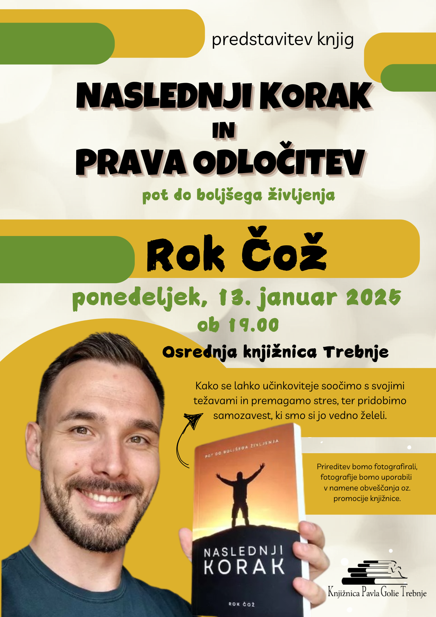V ponedeljek, 13. 1. 2025, ob 19.00, vas vabimo v Osrednjo knjižnico Trebnje na predstavitev knjig Naslednji korak in Prava odločitev, gost bo avtor knjig, Rok Čož.