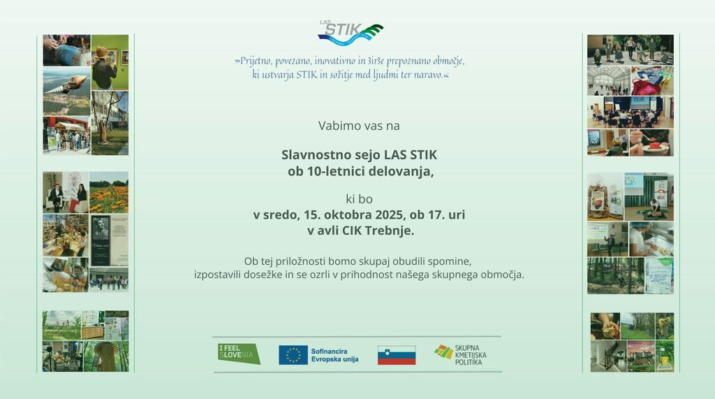 Ob praznovanju jubileja v sredo, 15. oktobra 2025, ob 17. uri pripravljamo Slavnostno sejo LAS STIK, ki jo bodo gostili v avli CIK Trebnje (Kidričeva ul. 2, Trebnje), sicer vodilnega partnerja LAS STIK.