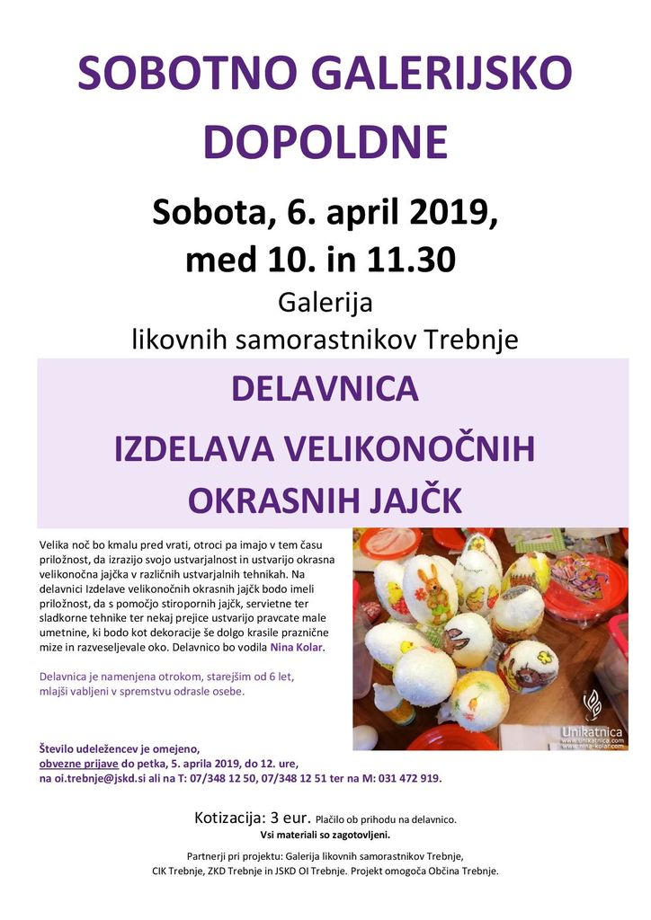 V sodelovanju z JSKD Trebnje bo 6. aprila med 10. in 11.30 v sklopu Sobotnega galerijskega dopoldne potekala delavnica Izdelava velikonočnih okrasnih jajčk.
