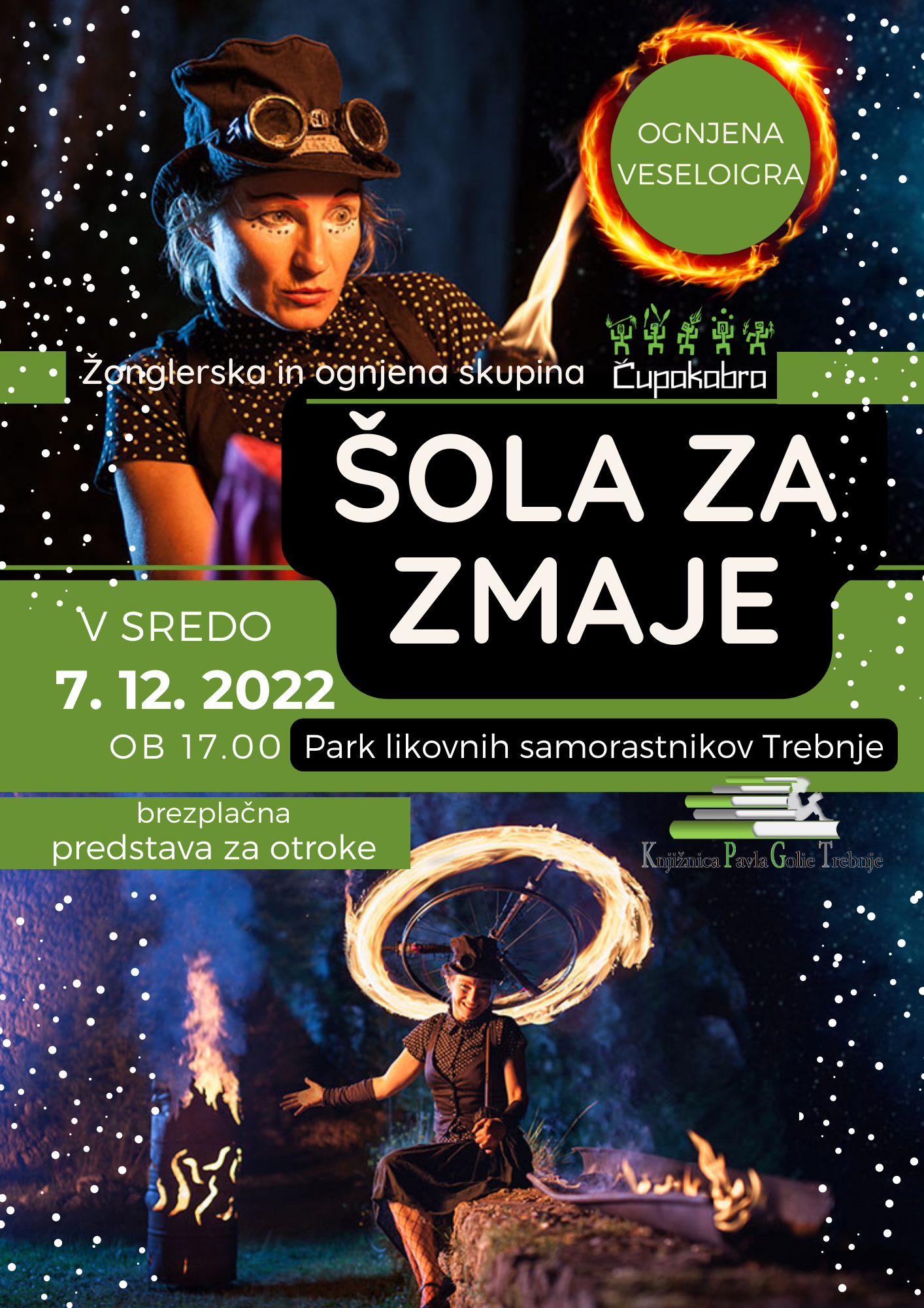 V sredo, 7. decembra 2022, vas ob 17:00 vabimo pred knjižnico Pavla Golie Trebnje, v Park likovnih samorastnikov Trebnje, kjer bomo uživali ob cirkuški ognjeni veseloigri Šola za zmaje v izvedbi žonglerske in ognjene skupine Čupakabra.
