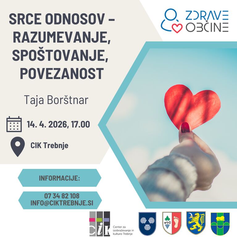 Vabljeni na brezplačno predavanje »Srce odnosov – razumevanje, spoštovanje, povezanost«, v torek, 14. 4. 2026, ob 17.00 na Centru za izobraževanje in kulturo Trebnje, Kidričeva ulica 2. Na predavanje se lahko prijavite TUKAJ.