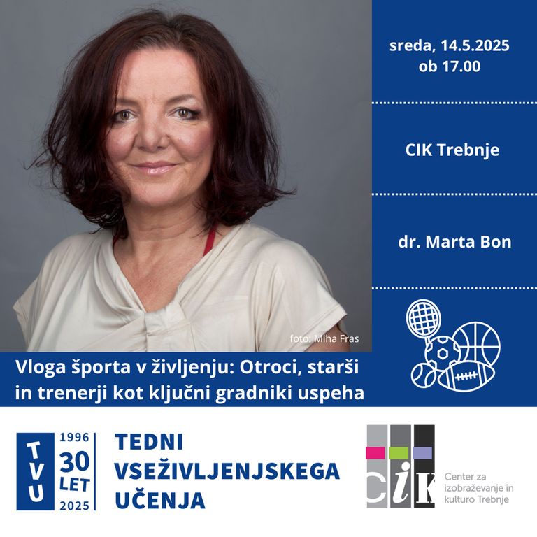 V sredo, 14. 5. 2025, ob 17.00 vas vabimo na brezplačno predavanje Vloga športa v življenju: Otroci, starši in trenerji kot ključni gradniki uspeha, na CIK Trebnje, velika predavalnica. Predavanje bomo izvedli v okviru Tednov vseživljenjskega učenja. Predavateljica dr. Marta Bon. Na predavanje se lahko prijavite na povezavi: https://prijave.snipi.si/ybPbS2h5bwD