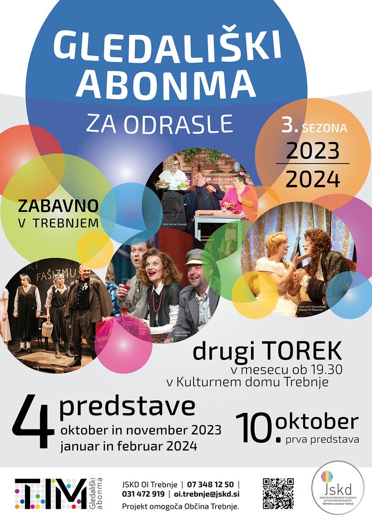 Cena abonmaja za vse štiri gledališke komedije je 40 evrov, na trebanjski JSKD pa ga vpisujemo do 10. oktobra. Vpis bo možen tudi eno uro pred prvo predstavo v avli Kulturnega doma Trebnje. Seveda bo možen tudi ogled posamezne predstave, cena vstopnice za izven bo 15 evrov. Več informacij: oi.trebnje@jskd.si in Abonma TIM 2023_2024