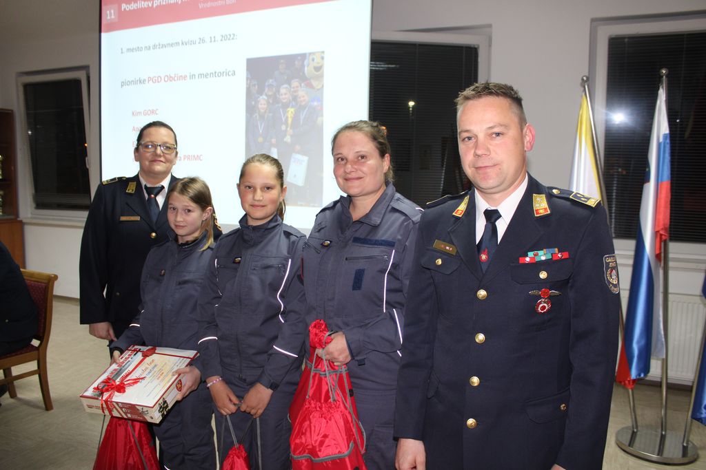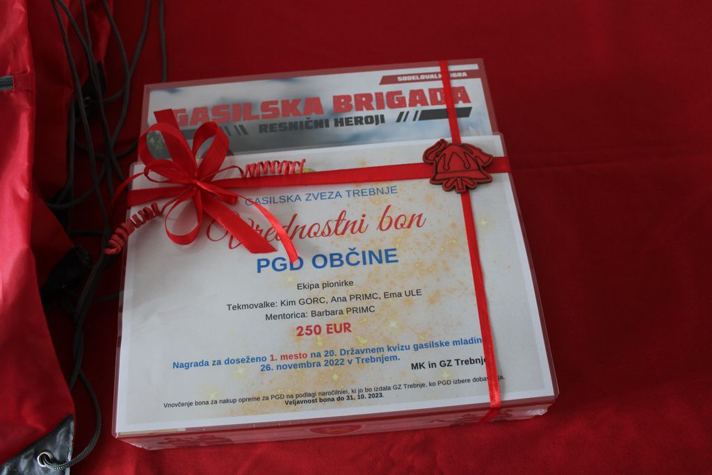 Vrednostni bon za nakup opreme so podelili ekipi pionirk PGD Občine, državnim prvakinjam lanskega 20. Državnega kviza, ki je potekal v Trebnjem.