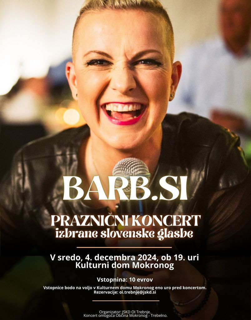V sredo, 4. decembra 2024, vas ob 19. uri vabimo v Kulturni dom Mokronog na Praznični koncert izbrane slovenske glasbe BARB.SI.