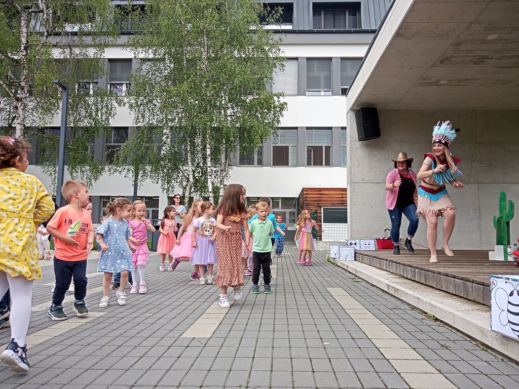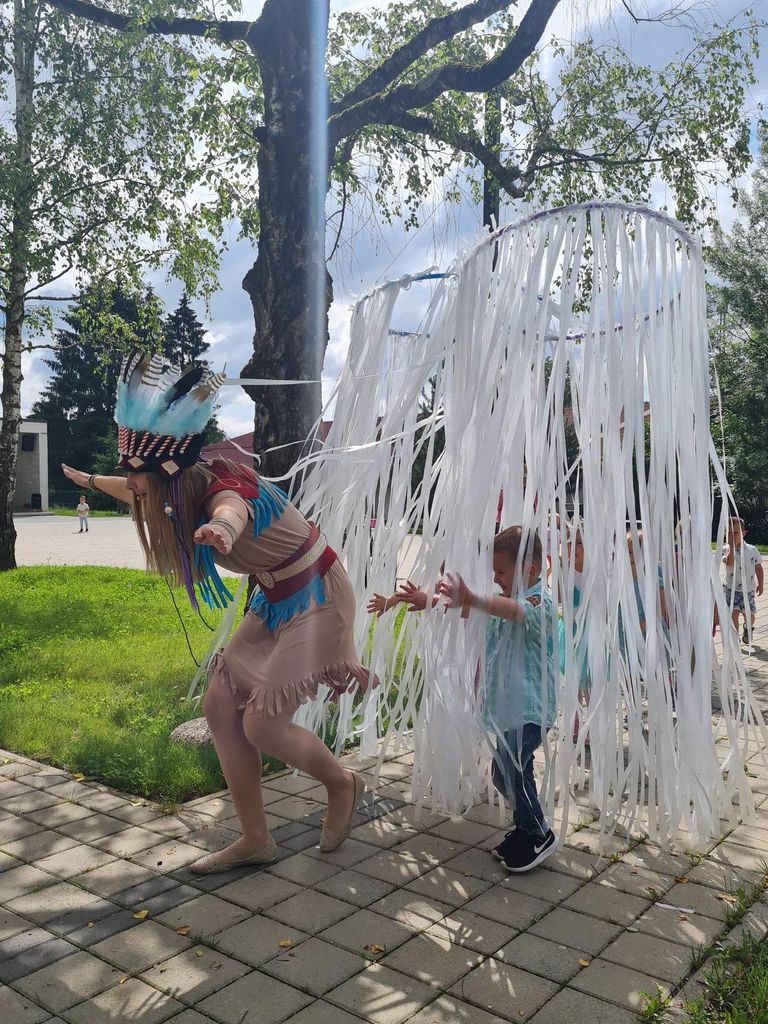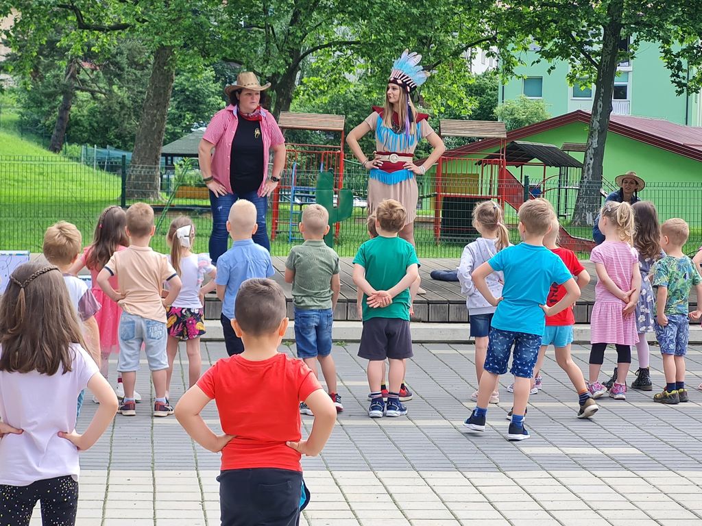 Zjutraj nas je obiskalo 10 skupin vrtčevskih otrok. Pričakovali so Karmen in Mojco, ki sta obljubljali plesno-gibalno delavnico … Njiju pa od nikoder. Še sreča, da sta mimo prišli kavbojka Džeki in Indijanka Modro nebo. Menda sta skupaj z otroki klicali dež …