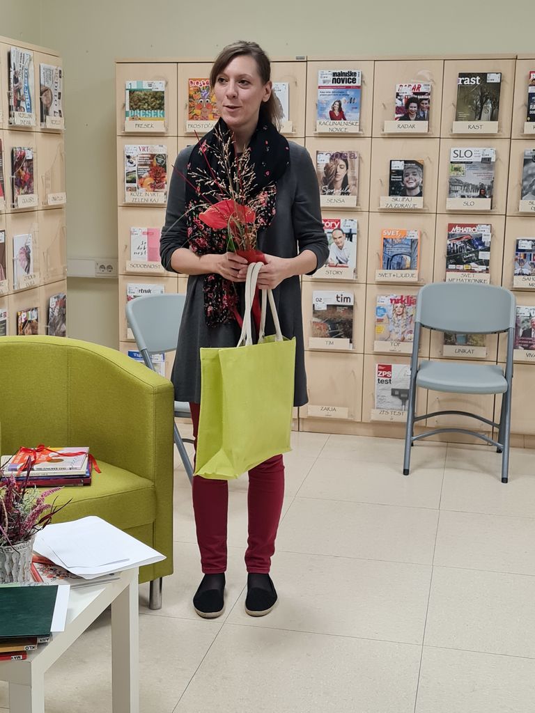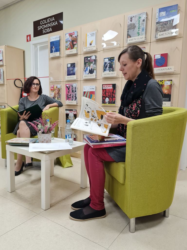 Nato je sledil pogovor z Marto Bartolj, v katerem smo izvedeli veliko o njenih likovnih začetkih, nagradah, ustvarjalnem procesu ter o ilustriranju mladinske drame Sneguljčica Pavla Golie, ki jo bo naša knjižnica izdala v prihodnjem letu.