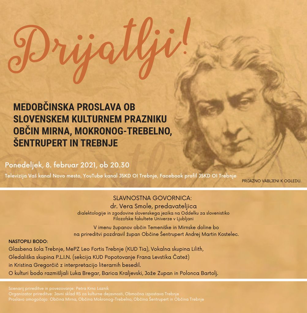 Tradicionalna medobčinska prireditev občin Mirna, Mokronog-Trebelno, Šentrupert in Trebnje Prijatli! ob slovenskem kulturnem prazniku v luči razmer epidemije novega koronavirusa letos poteka nekoliko drugače.