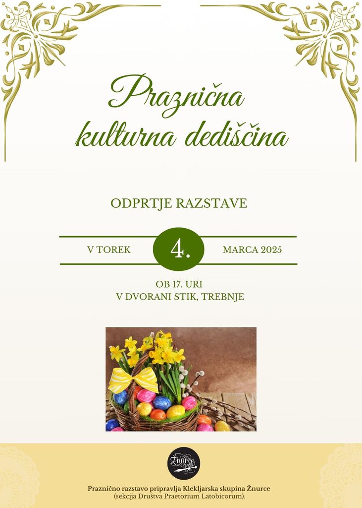 Vabimo vas na odprtje razstave Praznična kulturna dediščina, ki bo v torek, 4. marca, ob 17. uri, v dvorani Stik Trebnje. Razstava bo na ogled do 17. aprila in bo osvetlila bogastvo ročnih del ter okrasja, ki so nepogrešljiv del prazničnega vzdušja v slovenskih domovih.
