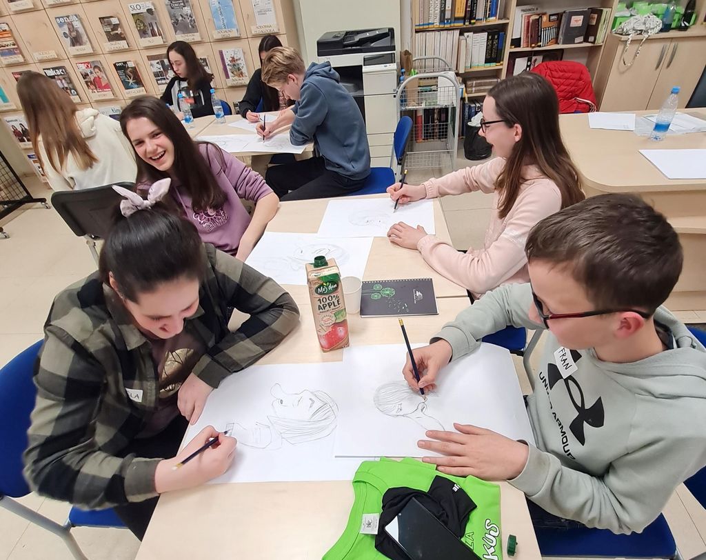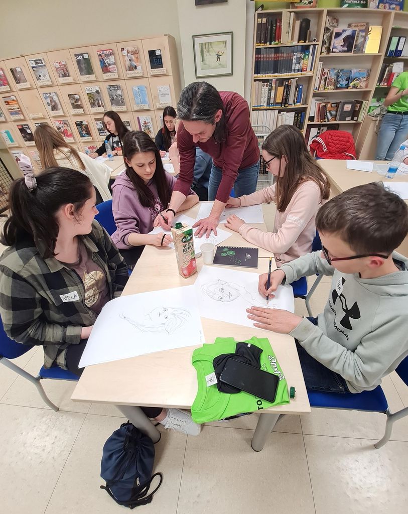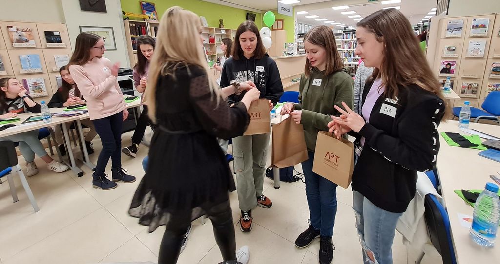 Povabili smo učence iz OŠ Trebnje, Mirna, Mokronog, Šentrupert in Veliki Gaber. Knjižničarke smo pripravile zanimiv program: najprej smo se spoznali med seboj, nadaljevali smo z vrtenjem kolesa sreče in tako spoznali Andersenovo življenje ter delo. Obiskali sta nas tudi kozmetičarki iz podjetja Beauty bar Art- Pe, Maja in Taša. ki sta nam povedali nekaj o negi mladostniške kože, predvsem v času pubertete. Z očiščeno in navlaženo kožo smo nadaljevali program. Pogasnili smo luči, pripravili atmosfero in knjižničarka Mojca je pričela s pripovedovanjem strašljive Andersenove pravljice Rdeči čeveljci. Sledila je malica, ki je bila letos ponovno bogata in zelo okusna, za kar se moramo zahvaliti našim lokalnim donatorjem, za nas so pripravili pice, pohančke, jogurte, krofe … Okrepčani smo se lotili risanja karikatur iz Andersenovih pravljic. Delavnico je vodil Simon Sanda, ustanovitelj in učitelj Risarnice. Čakal nas je še najzabavnejši del – predstava Juha iz žeblja knjižničark Mojce in Karmen.