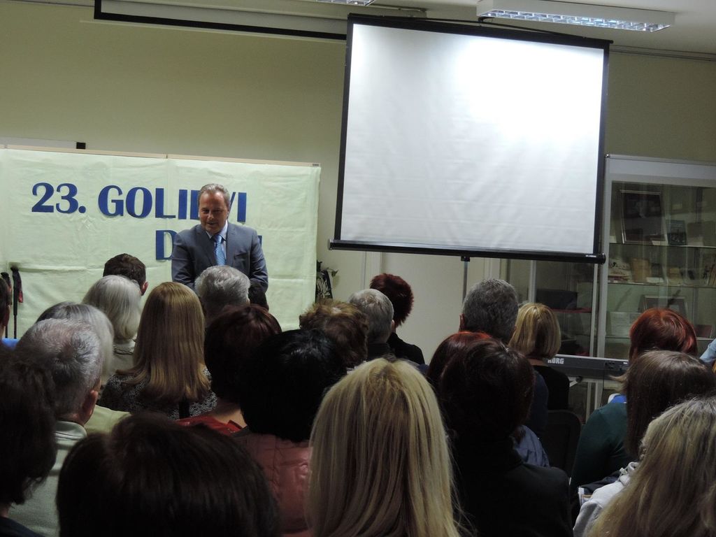Knjižnica Pavla Golie Trebnje namreč vsako leto, ob sofinanciranju Občine Trebnje, obeležuje Golieve dneve, s katerimi zaključimo tudi bralno značko za odrasle Bralna potepanja in bralno značko za otroke Jurčkov nahrbtnik ter Ure pravljic. Kot se tak praznik spodobi, smo tudi letos Golieve dneve obeležili svečano. Po nagovoru direktorice knjižnice, Tanje Cuder, in župana Občine Trebnje, Alojzija Kastelica, smo prisluhnili bibliotekarki Patriciji Tratar. Pripravila je prispevek Neznani odtenki Pavla Golie, v katerem je spregovorila o njegovi ženi, veliki, vendar žal prezgodaj umrli ljubezni.