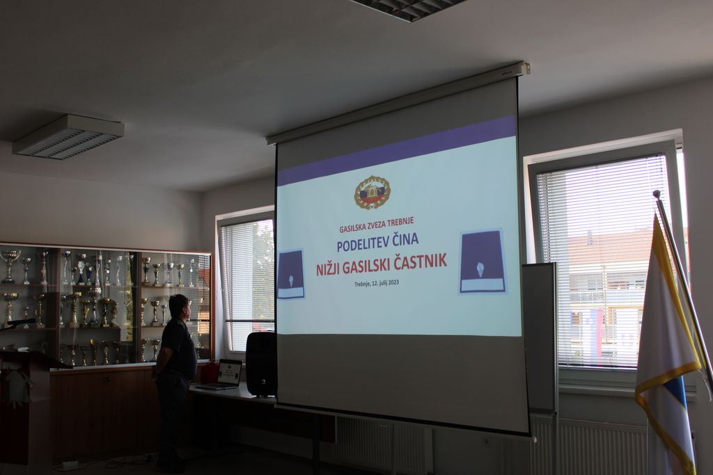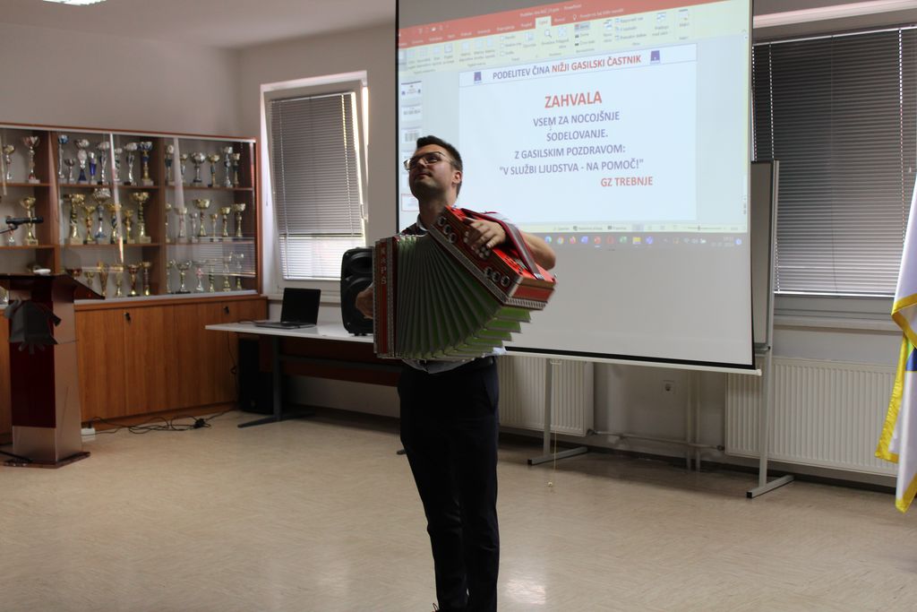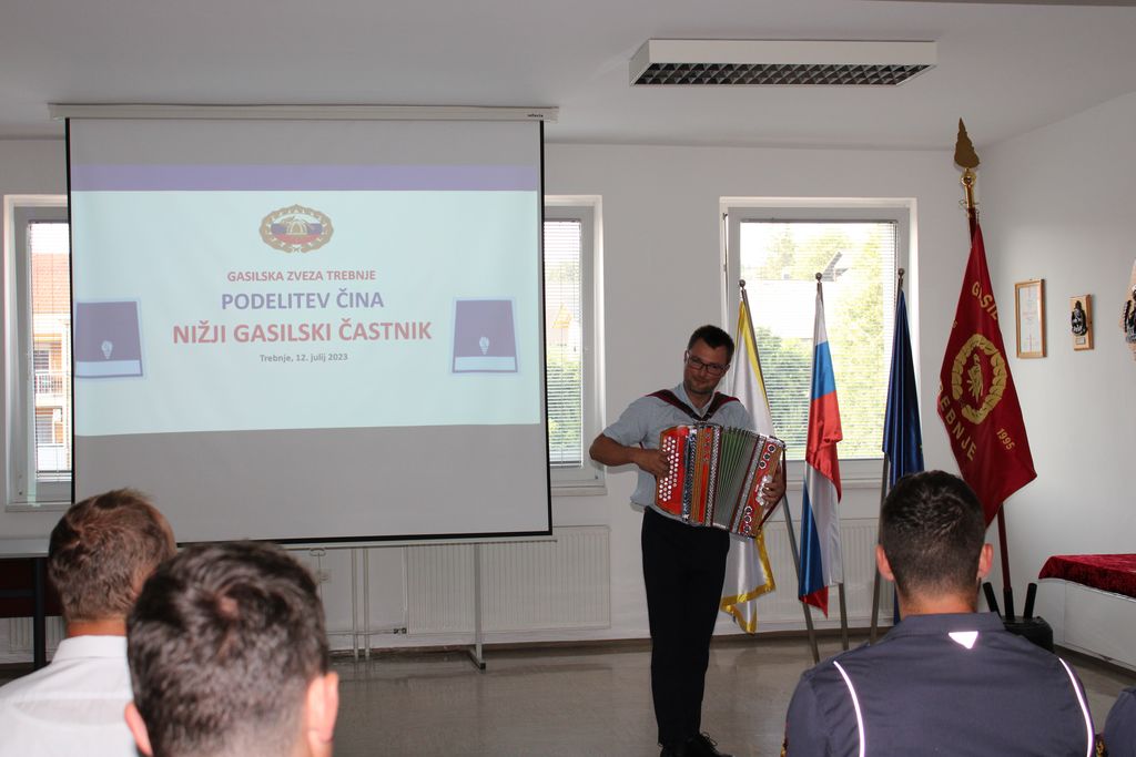 Uspešnemu zaključku vseh obveznosti, ki jih ni malo pri tem tečaju, je v sredo, 12. julija 2023, v dvorani PGD Trebnje potekala še svečana podelitev čina za 21 novih NGČ. Z obiskom so svečani dogodek počastili župan Občine Mirna in Šentrupert ter podžupan Občine Mirna in Trebnje, poveljniki GPO-jev, sektorjev, predsedniki in poveljniki društev prejemnikov čina ter predavatelji in inštruktorji, ki so odigrali pomembno vlogo pri izvedbi tečaja. Z glasbenim programom je svečani dogodek obogatil harmonikar Sandi Ravbar, profesor na Glasbeni šoli Trebnje.