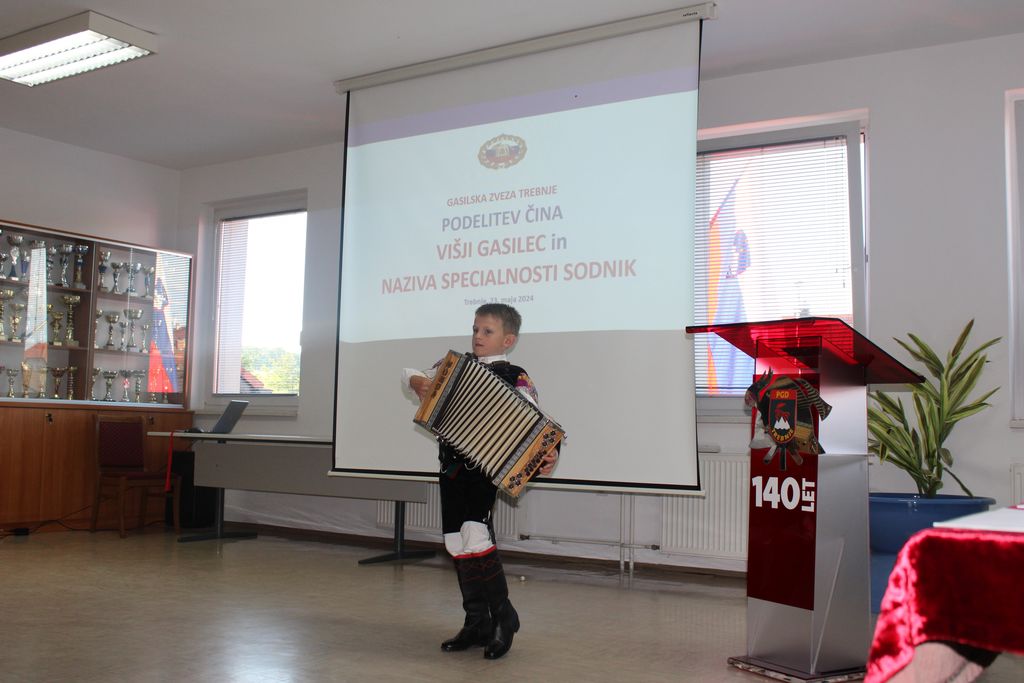 Po zaključku tečajev je GZ Trebnje v četrtek zvečer v dvorani PGD Trebnje je pripravila svečano podelitev čina višji gasilec in naziva specialnosti sodnik, ki so se je poleg vodstva Zveze, poveljnikov društev, sektorjev in GPO-jev udeležili tudi podpredsednik Gasilske zveze Slovenije in predsednik Gasilske regije Dolenjska Martin Lužar ter podžupanja Občine Šentrupert in podžupana Občine Mirna in Trebnje. Župan in podžupanja Občine Mokronog-Trebelno sta se zaradi obveznosti opravičila in elektronsko sporočila čestitke k dosežku in napredovanju. Mladi harmonikar, prvošolec Nik Puhek, je svečani dogodek glasbeno obogatil in s svojim sproščenim nastopom navdušil in požel močne aplavze.