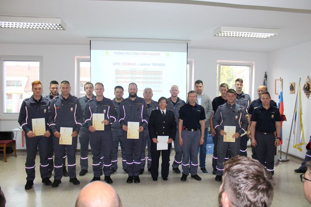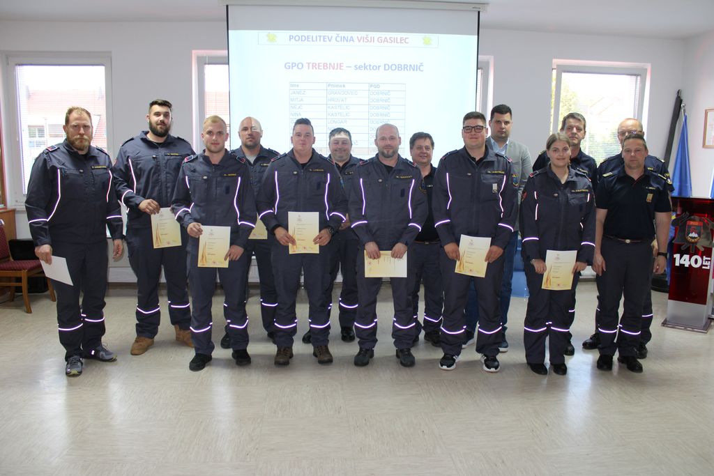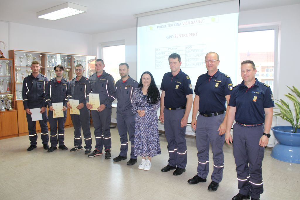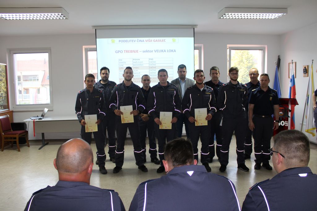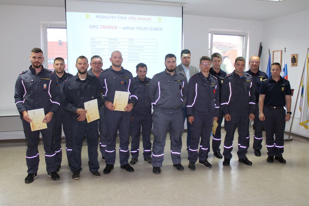 Novim višjim gasilcem sta na podelitvi Martin Lužar in Janez Uhan na rame delovne obleke namestila nov čin, Franci Hrovatič pa je izročil listino. Z opravljenim tečajem in napredovanjem v čin so tako novi višji gasilci in gasilke usposobljeni za izvajanje nalog vodenja skupine.