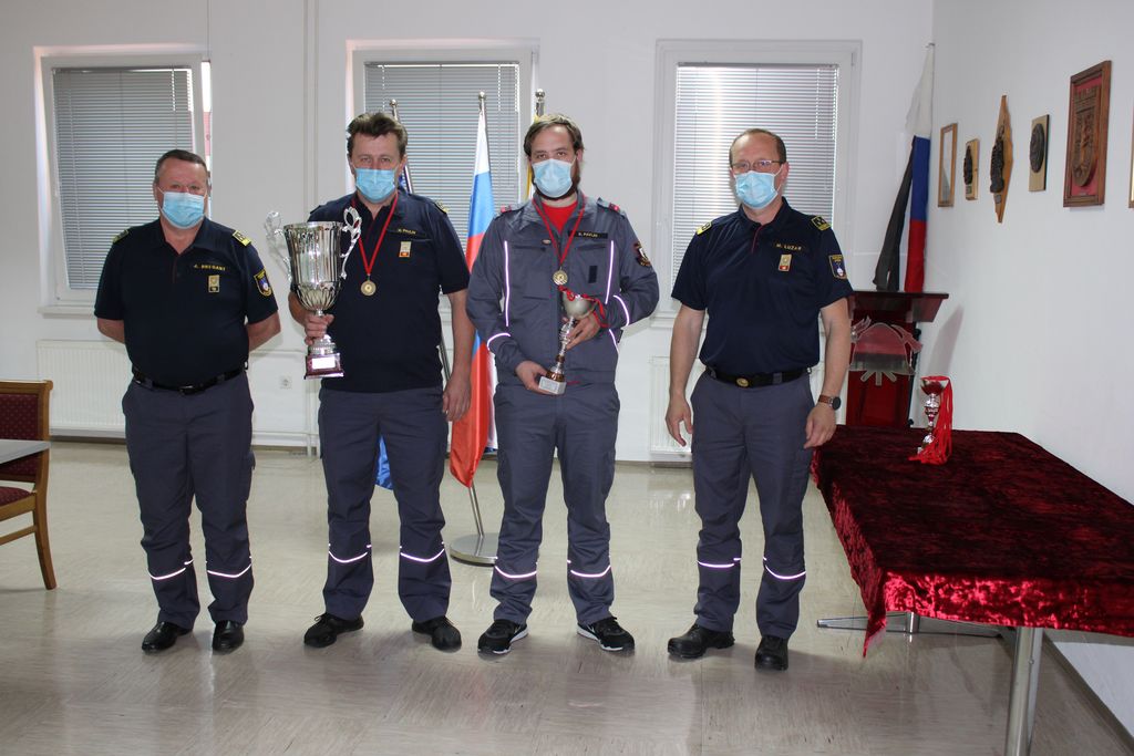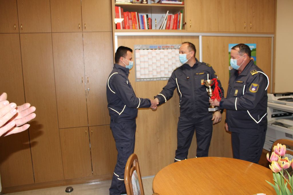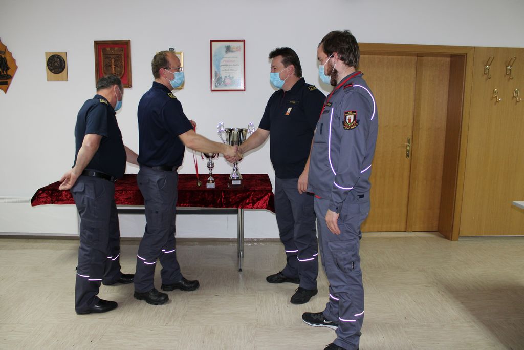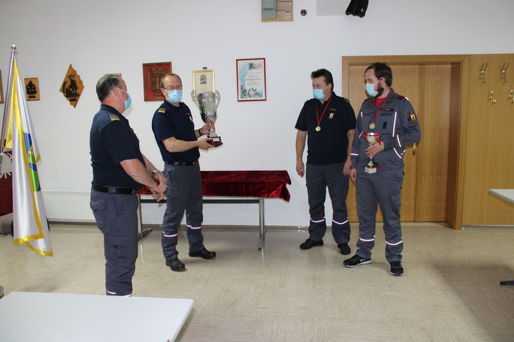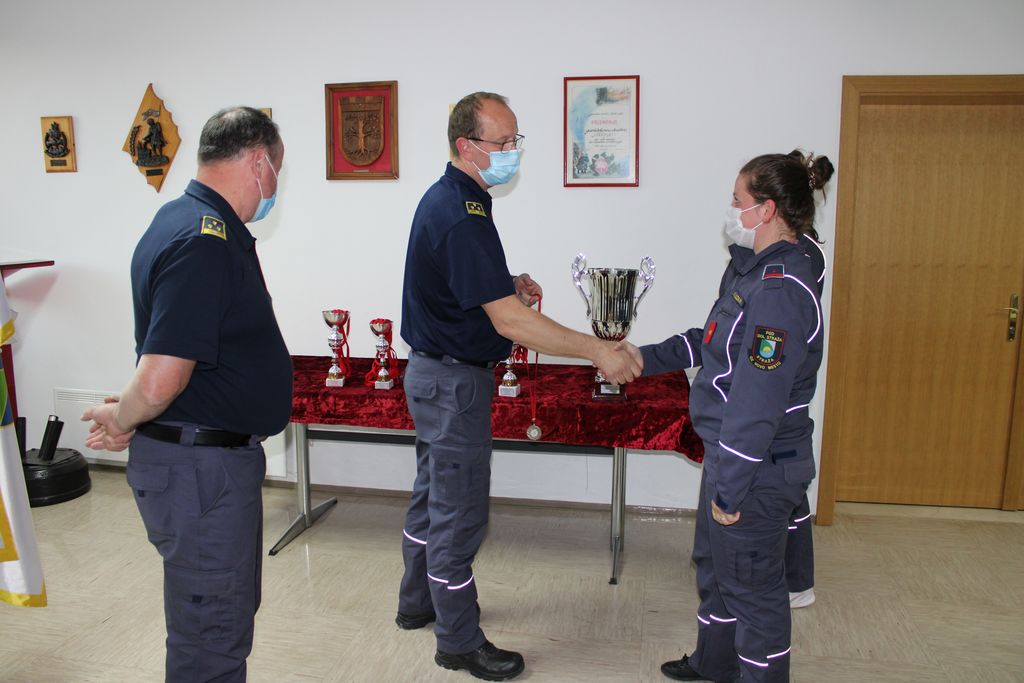Tako so v GZ Trebnje 24. marca letos izvedli podelitev kar v pisarni zveze, kjer sta poveljnik in predsednik GRD, Martin Lužar in Janez Bregant, predstavniku ekipe članov PGD Velika Strmica, Davidu Piškurju, izročila medalje in pokal za doseženo 2. mesto na Tekmovanju SSV za Pokal GRD za leto 2020.