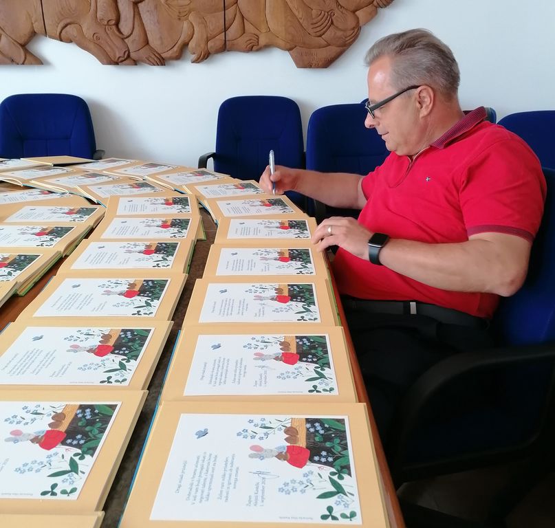 Prvošolcem je podaril knjigo STO UGANK, avtorice Anje Štefan in ilustratorke Jelke Reichman in jim zaželel prijetno branje.