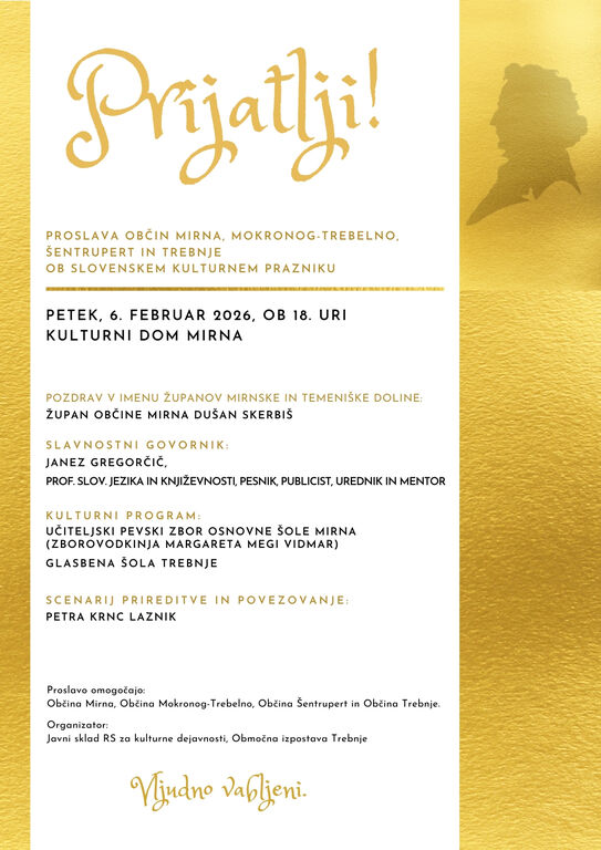 Občine Trebnje, Mirna, Šentrupert in Mokronog – Trebelno bodo tudi letos skupaj praznovale slovenski kulturni praznik s prireditvijo, poimenovano Prijatli. Potekala bo 6. februarja ob 18. uri v Kulturnem domu na Mirni.