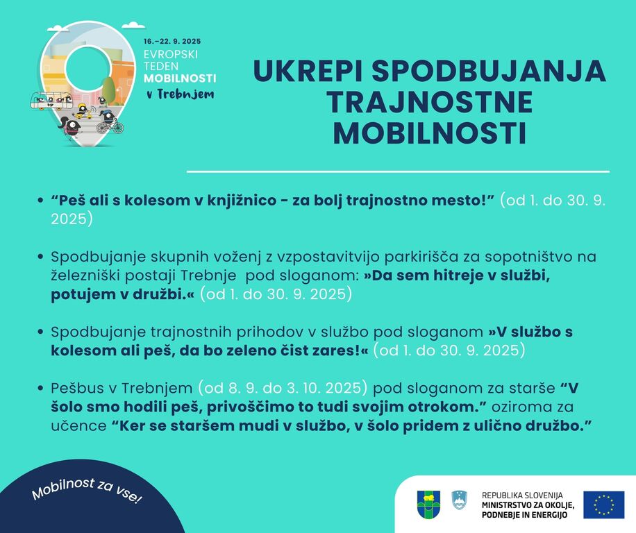 Skozi različne aktivnosti, kot so pobude »Peš ali s kolesom v knjižnico«, vzpostavitev parkirišča za sopotništvo na železniški postaji in spodbujanja prihodov v službo brez avtomobila, želi Občina Trebnje pokazati, da je mogoče marsikatero pot opraviti na zdravju in okolju prijazen način. Letos se pridružujemo tudi akciji Pešbus, ki bo osnovnošolcem omogočil zdravo in družabno pot v šolo.