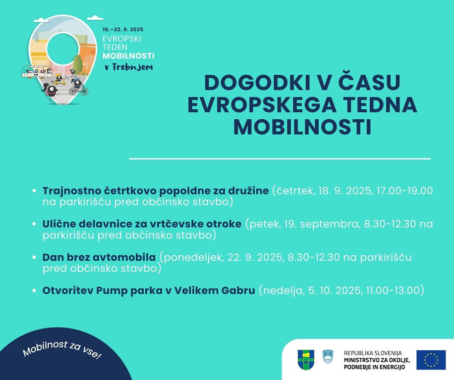Občina Trebnje se tudi letos pridružuje Evropskemu tednu mobilnosti, ki bo med 16. in 22. septembrom 2025, s številnimi dejavnostmi pa bomo občane k trajnostnim oblikam mobilnosti spodbujali kar ves september.