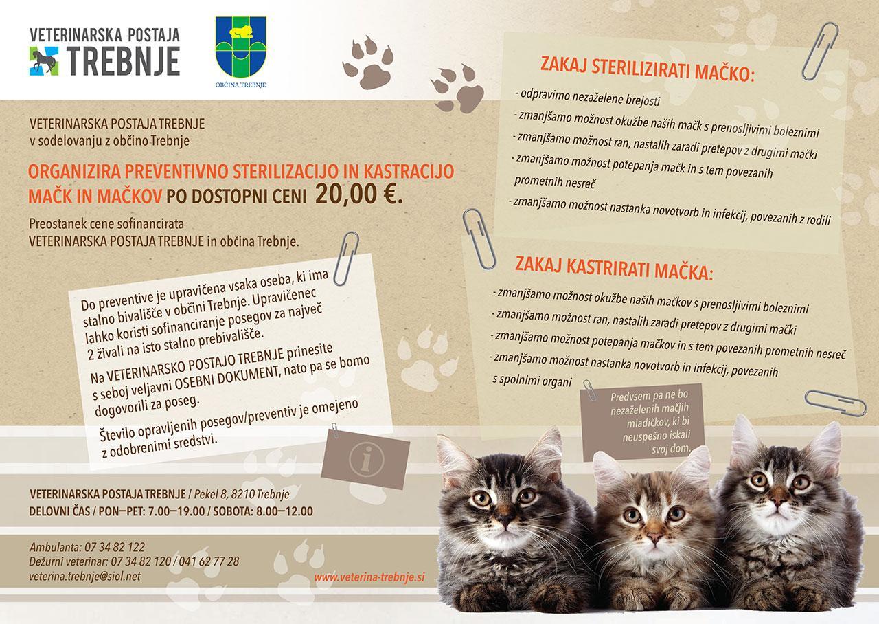 Občina Trebnje obvešča svoje občane, da imajo do sredine novembra možnost na Veterinarski postaji Trebnje, Pekel 8, 8210 Trebnje koristiti subvencionirano ceno sterilizacij oz. kastracij mačkov.