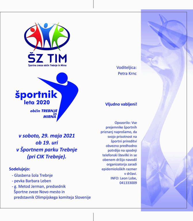 Podelitev nagrad in priznanj za športnika leta 2020 iz občin Trebnje in Mirna lahko v soboto, 29.5.2021 ob 19. uri spremljate preko interneta, na povezavi: