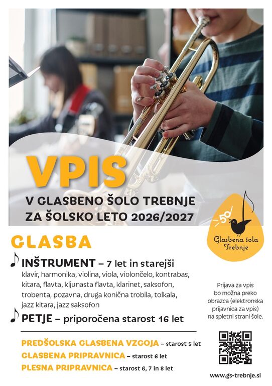 Glasbena šola Trebnje objavlja RAZPIS ZA VPIS NOVIH UČENCEV ZA ŠOLSKO LETO 2026/2027