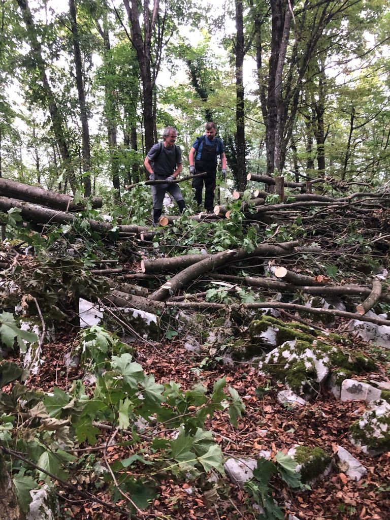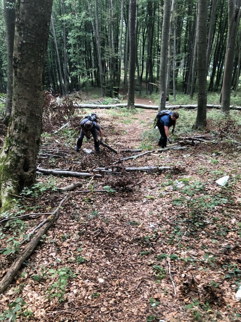 Prva skupina se je odpravila na pot Rdeči Kal proti Ostremu vrhu, kjer so čistili in odstranjevali podrta drevesa ter obnavljali markacije.