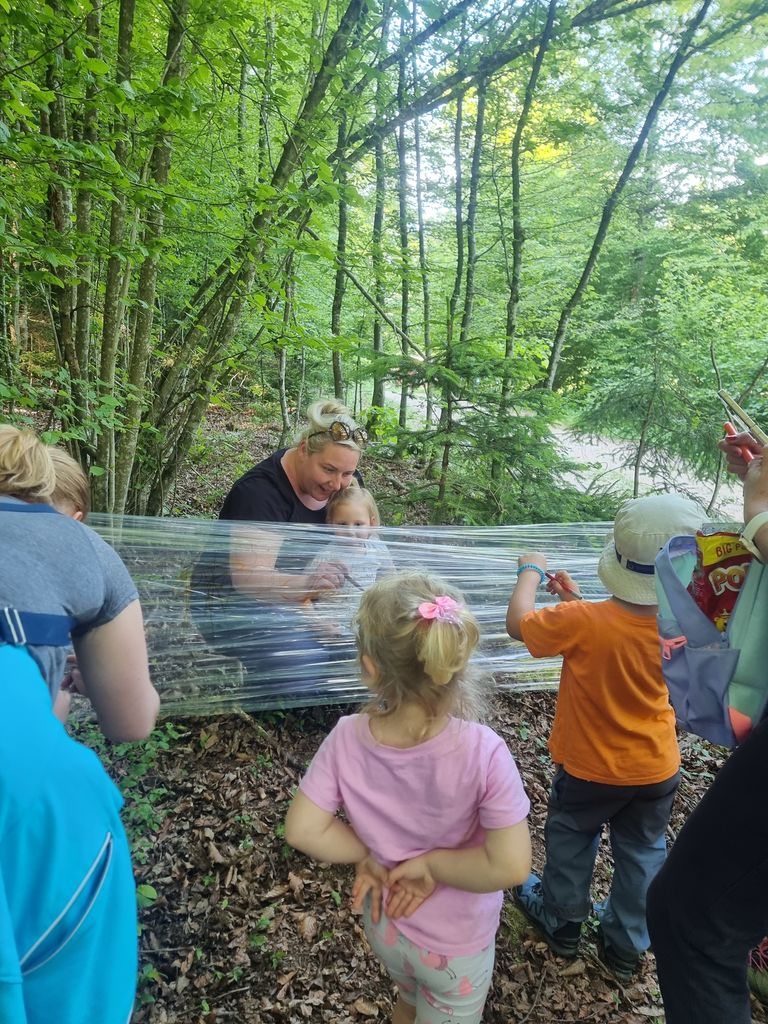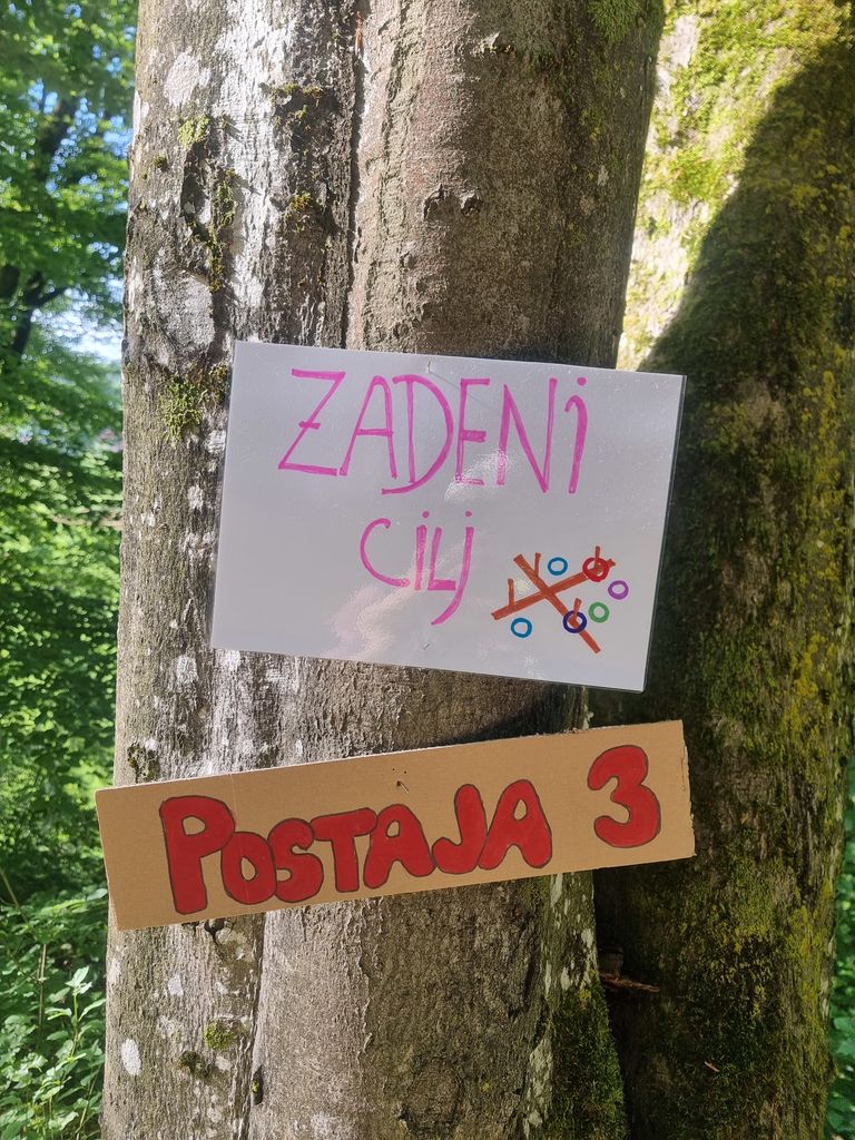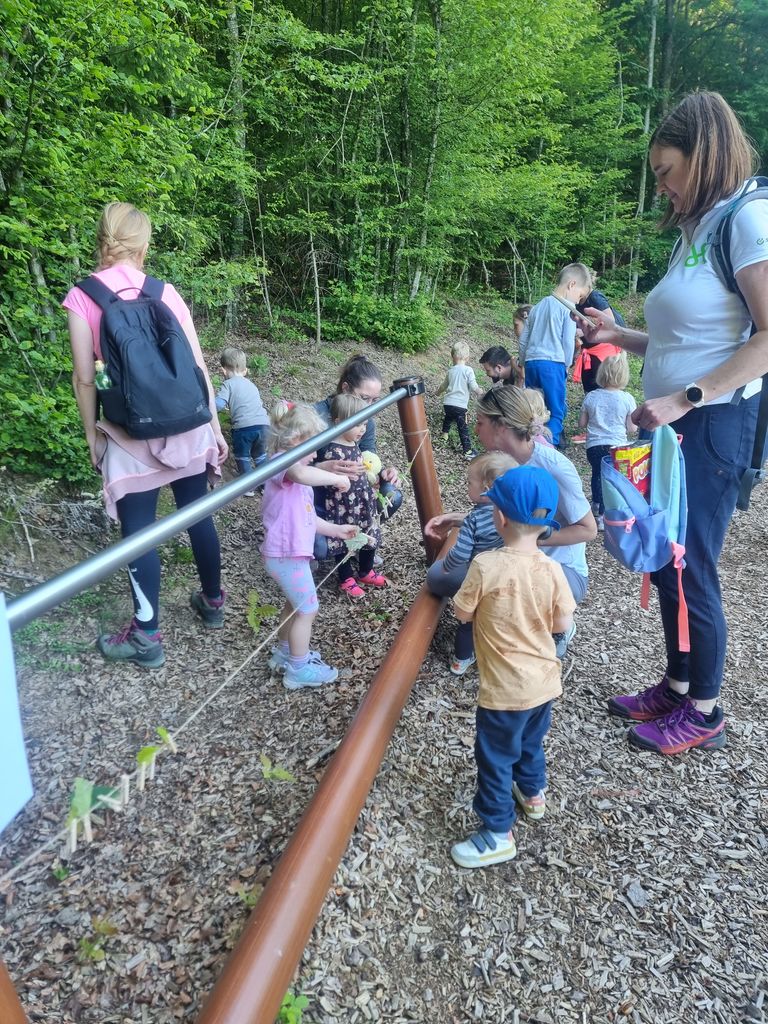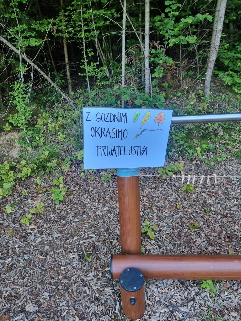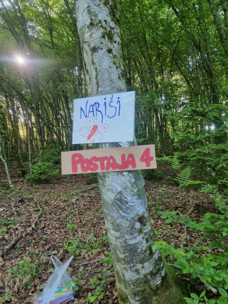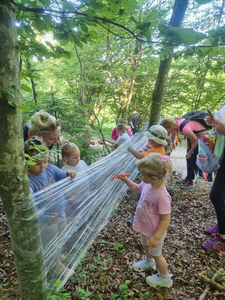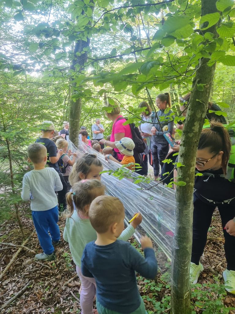 Zadnja postaja današnjega sprehoda je bila malo stran od poti. Na njej so otroci iskali liste ter jih pripenjali na vrv prijateljstva.