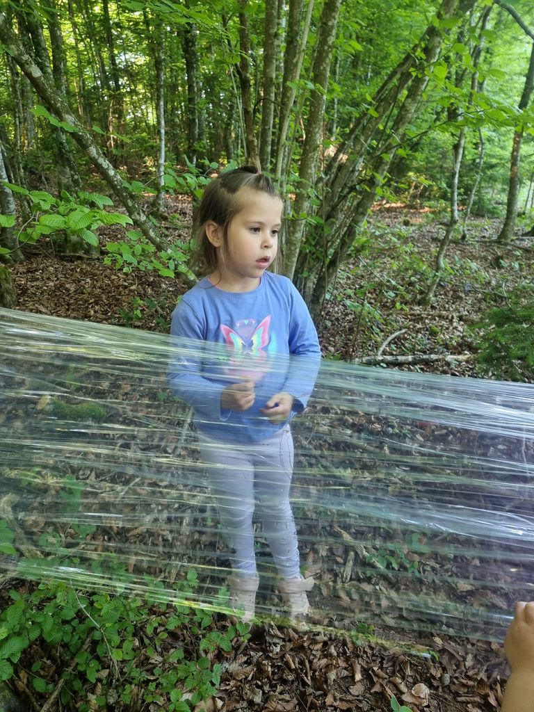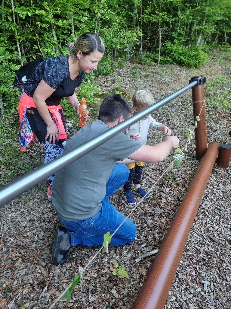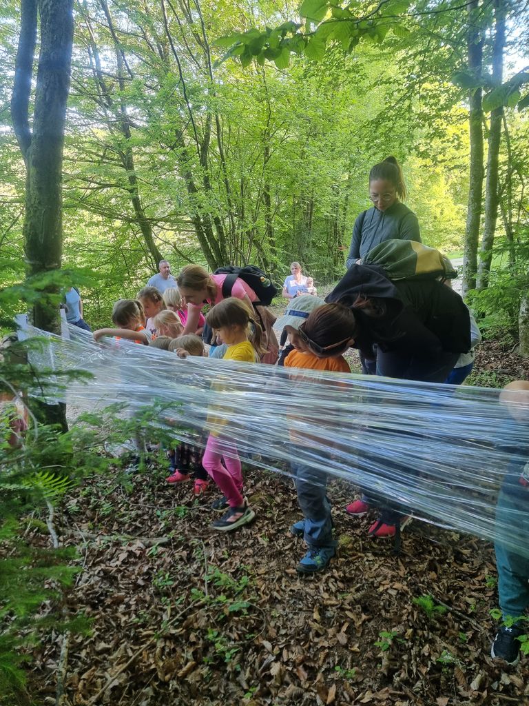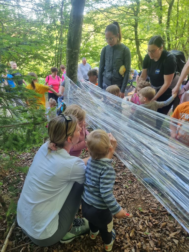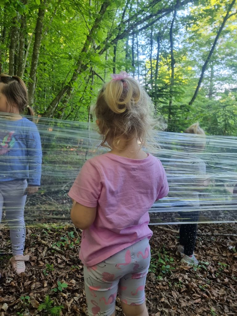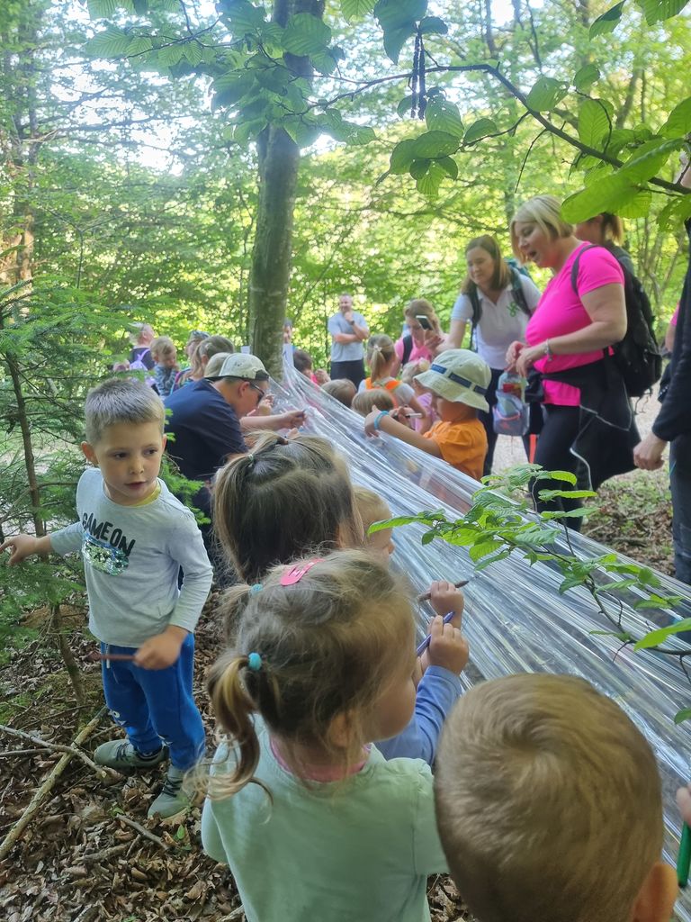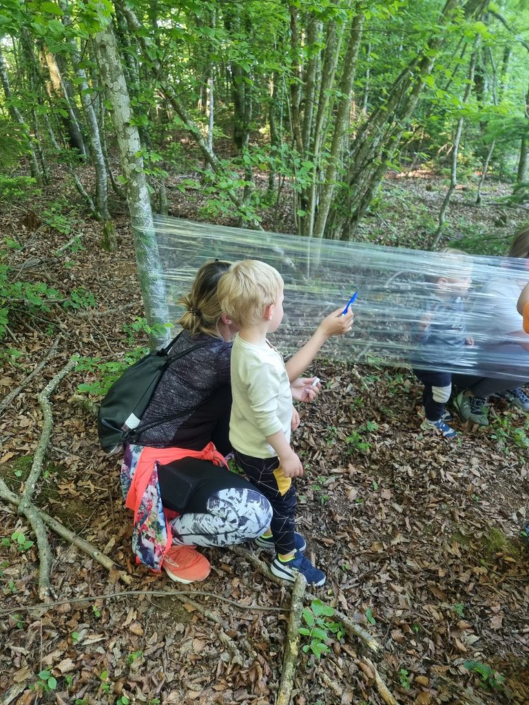 Zadnja postaja današnjega sprehoda je bila malo stran od poti. Na njej so otroci iskali liste ter jih pripenjali na vrv prijateljstva.