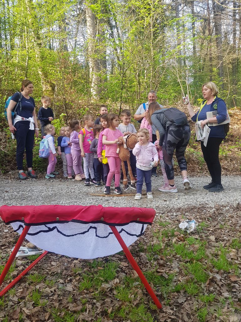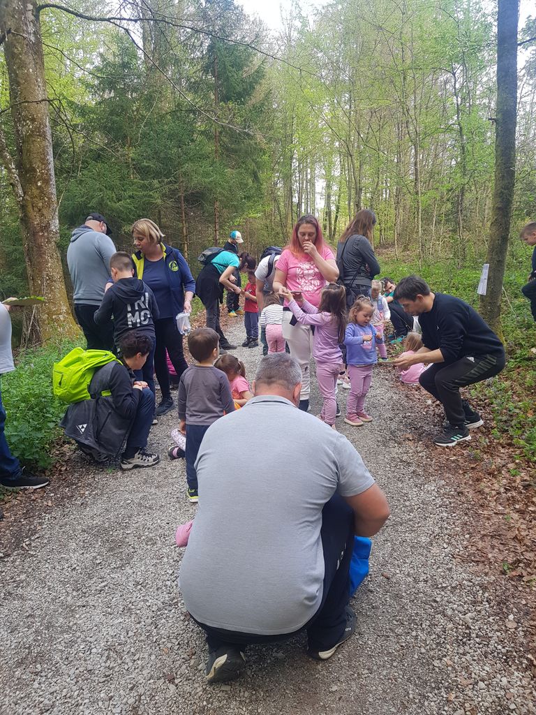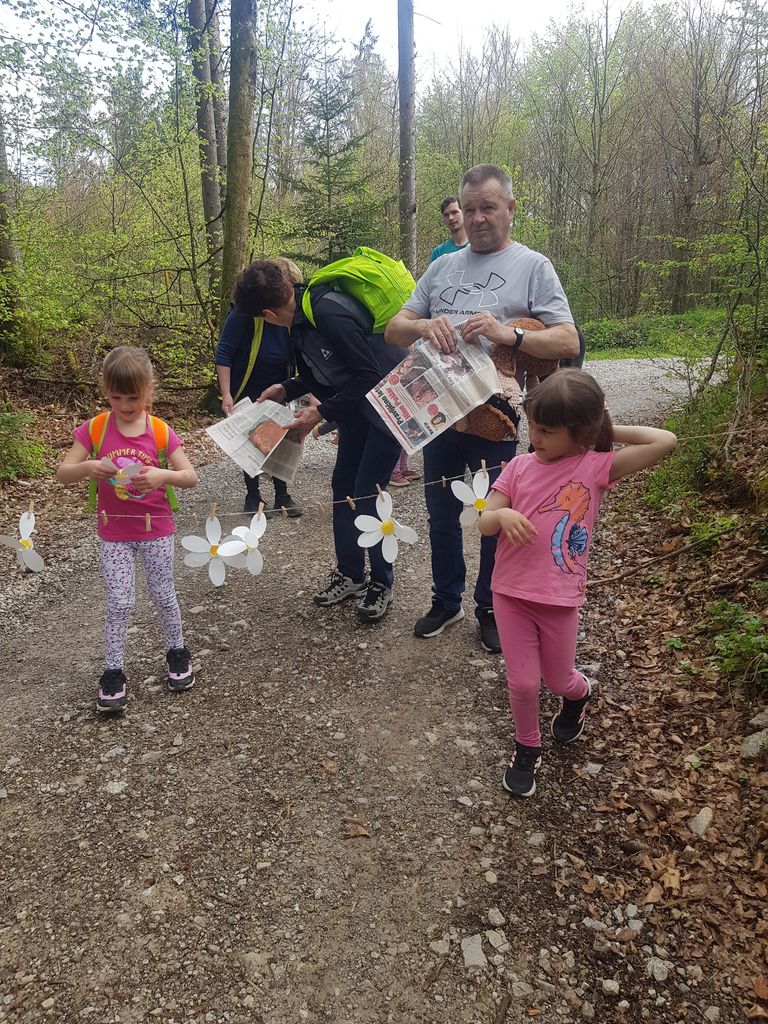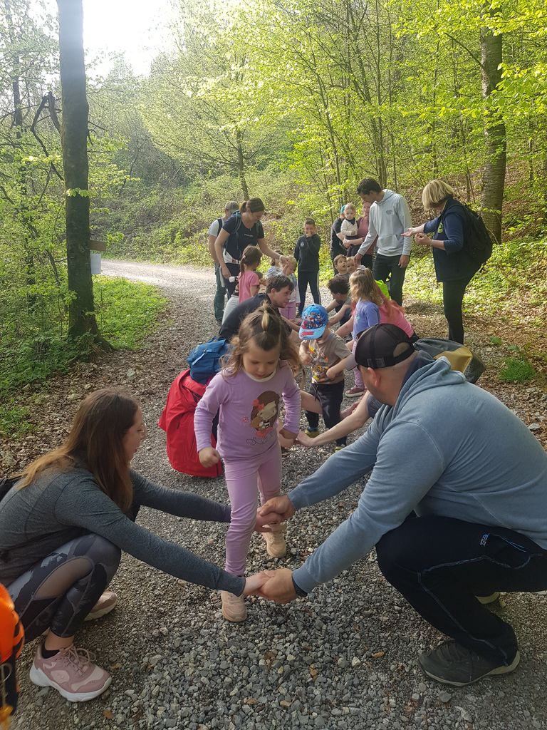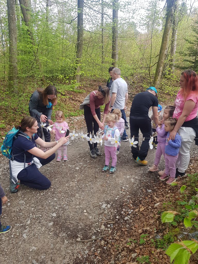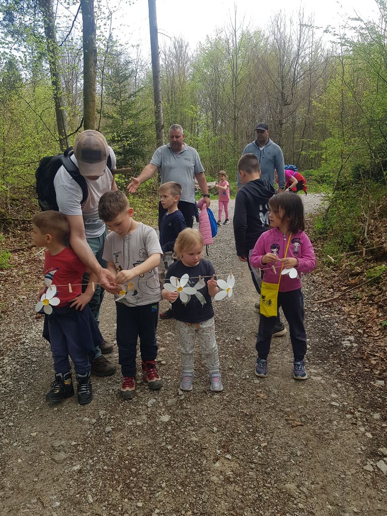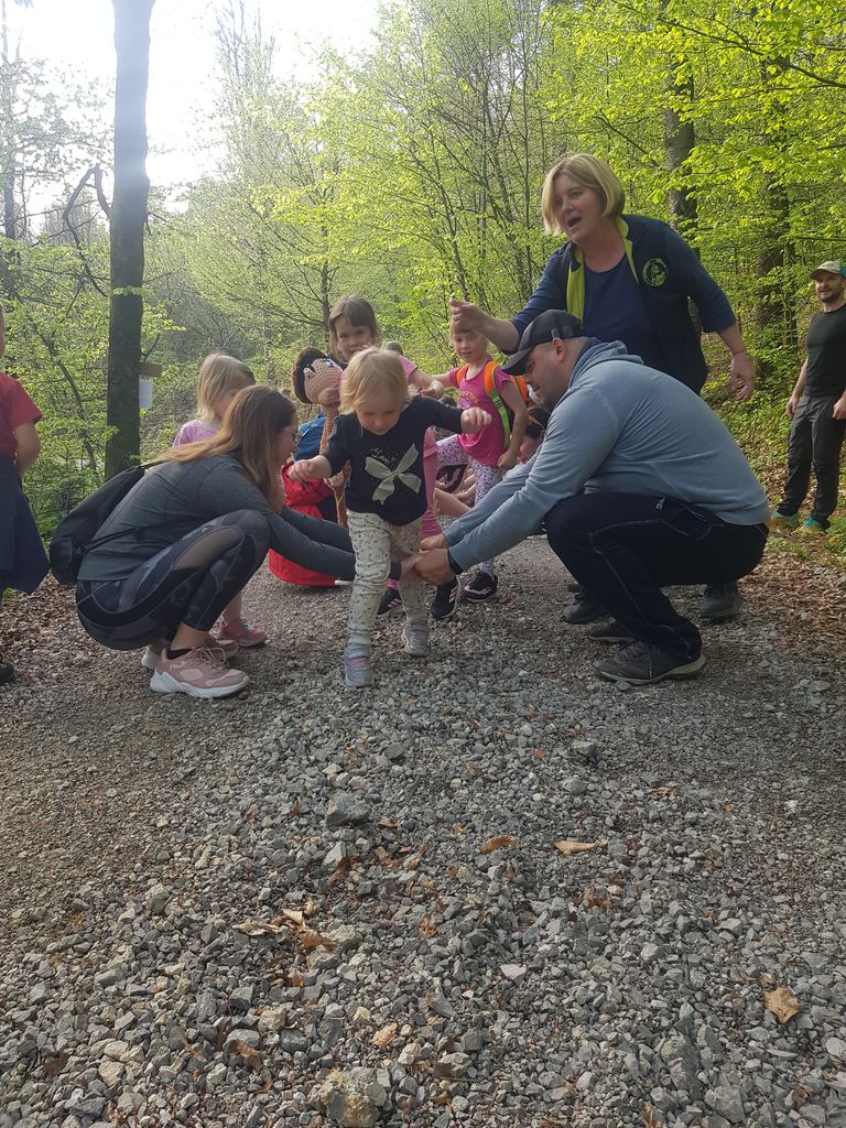 Po pozdravu smo se odpravili na del trim steze. Otroci so bili hoje po gozdu zelo veseli in so komaj čakali na postavljene postaje in reševanje nalog. Po postajah so nas vodile markacije in puščice. Že na prvi postaji so pri nalogi sodelovali tudi starši, saj so morali iz svojih rok narediti lestev katero so otroci z veseljem prehodili.