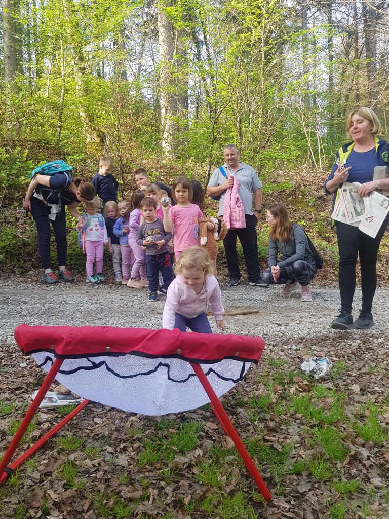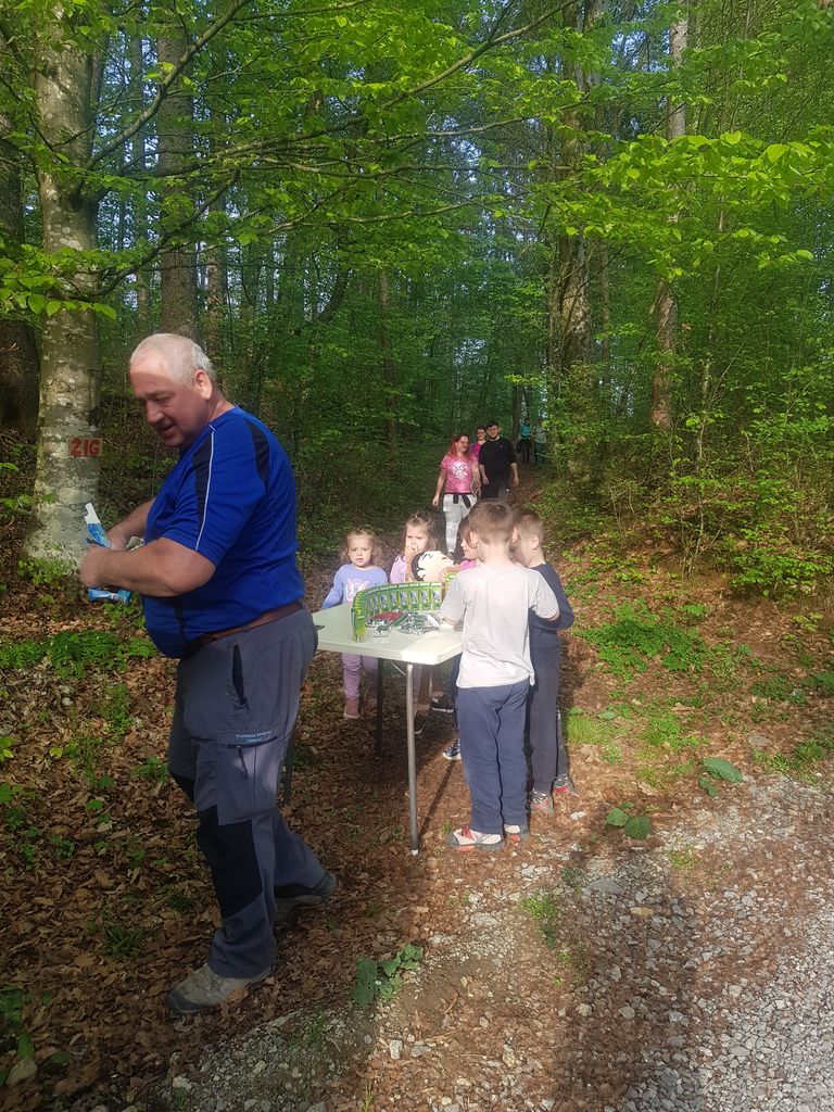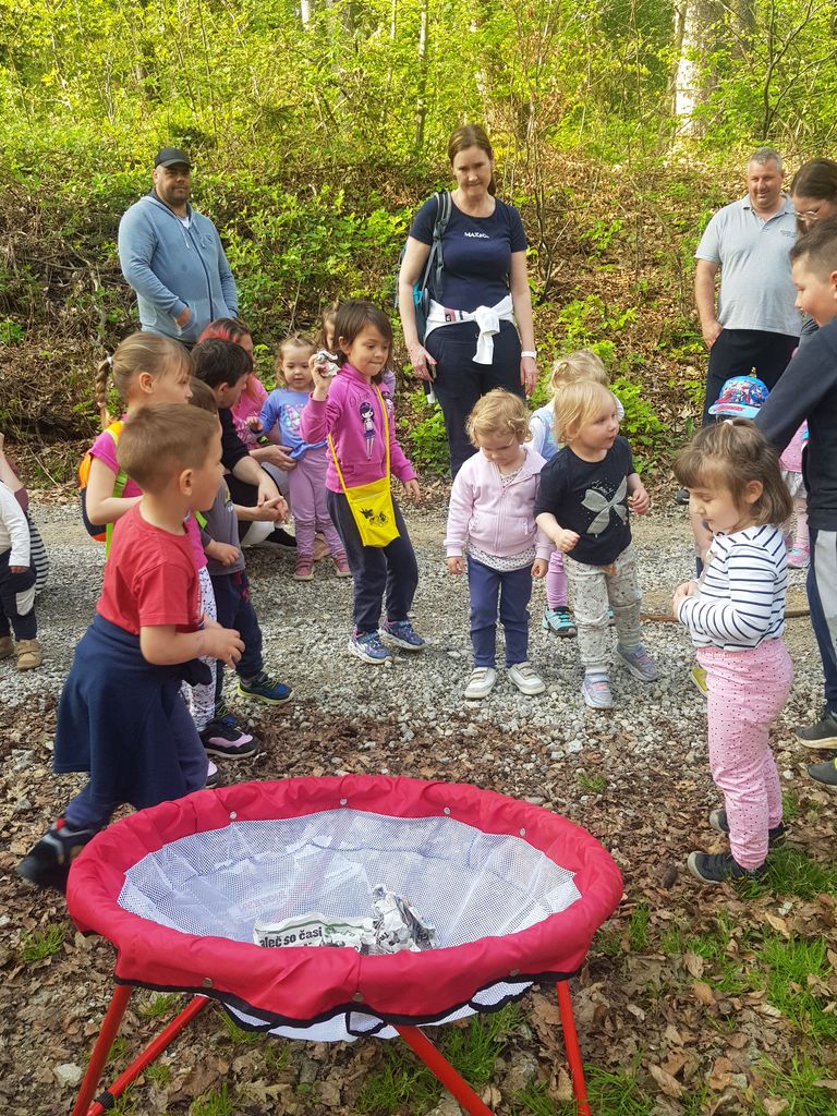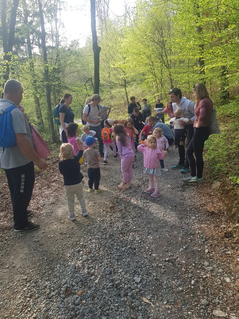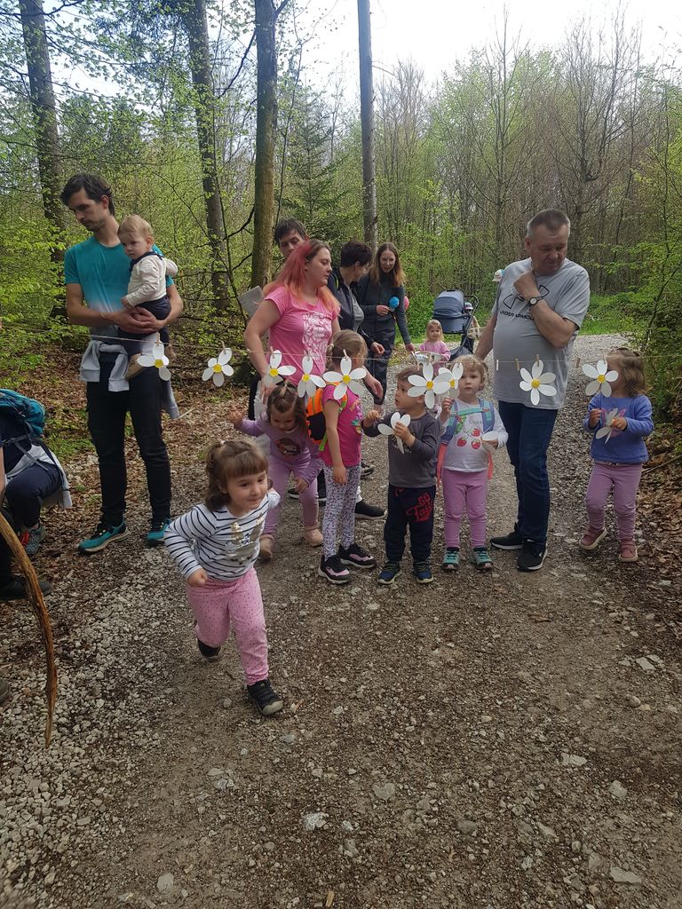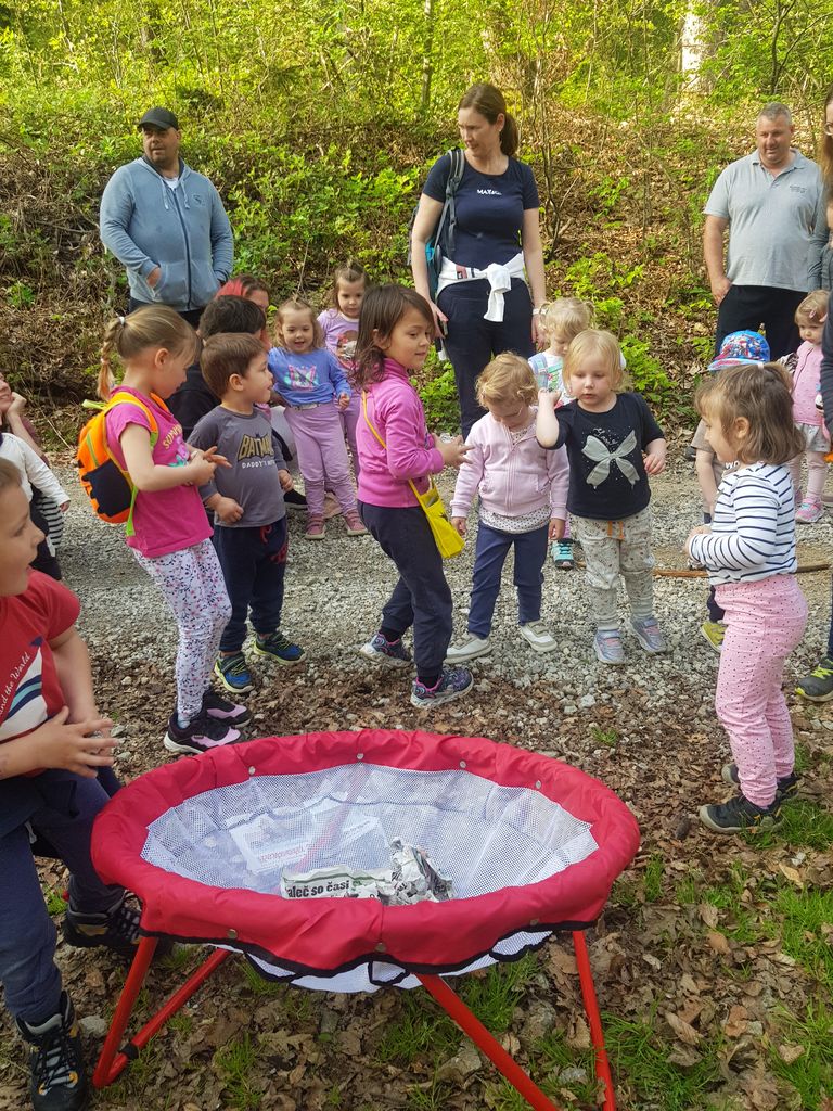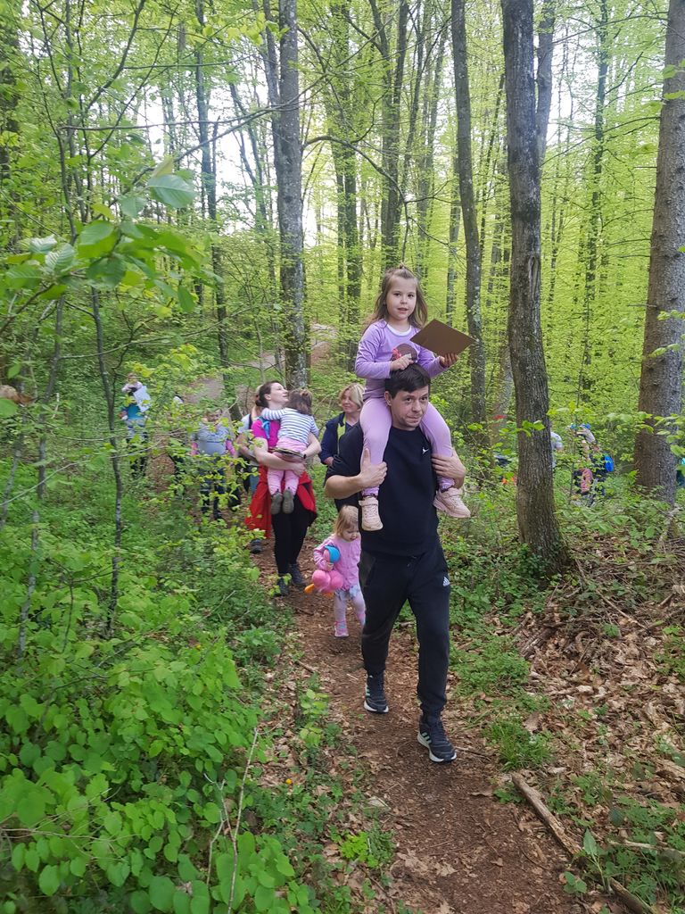 Po pozdravu smo se odpravili na del trim steze. Otroci so bili hoje po gozdu zelo veseli in so komaj čakali na postavljene postaje in reševanje nalog. Po postajah so nas vodile markacije in puščice. Že na prvi postaji so pri nalogi sodelovali tudi starši, saj so morali iz svojih rok narediti lestev katero so otroci z veseljem prehodili.