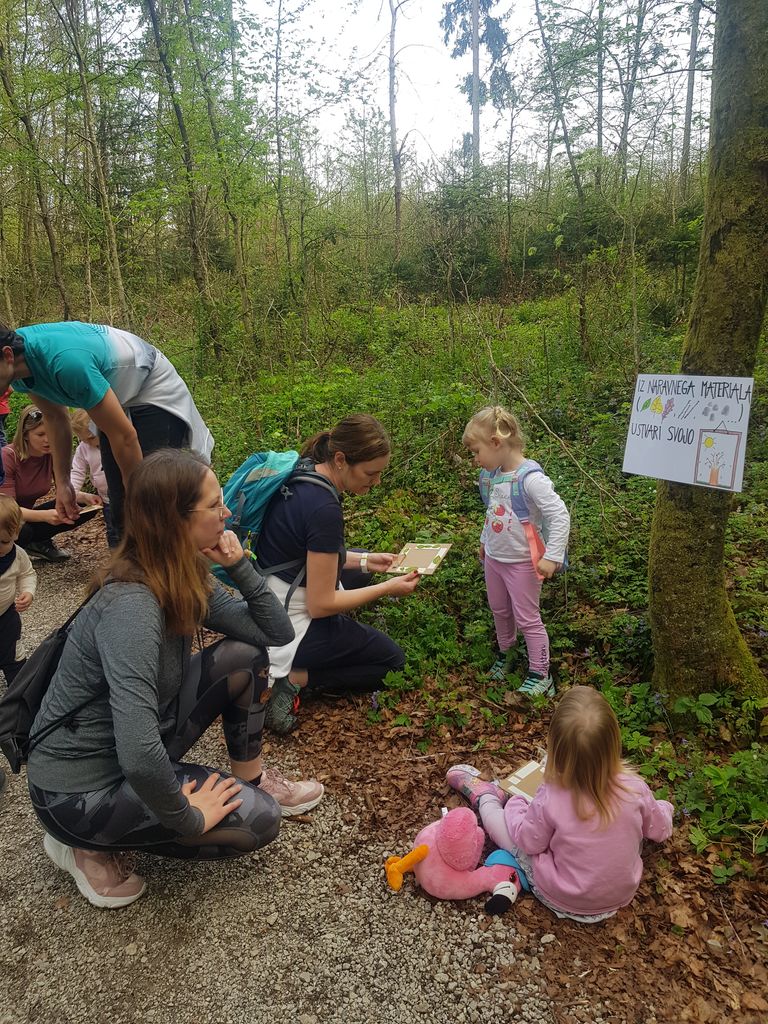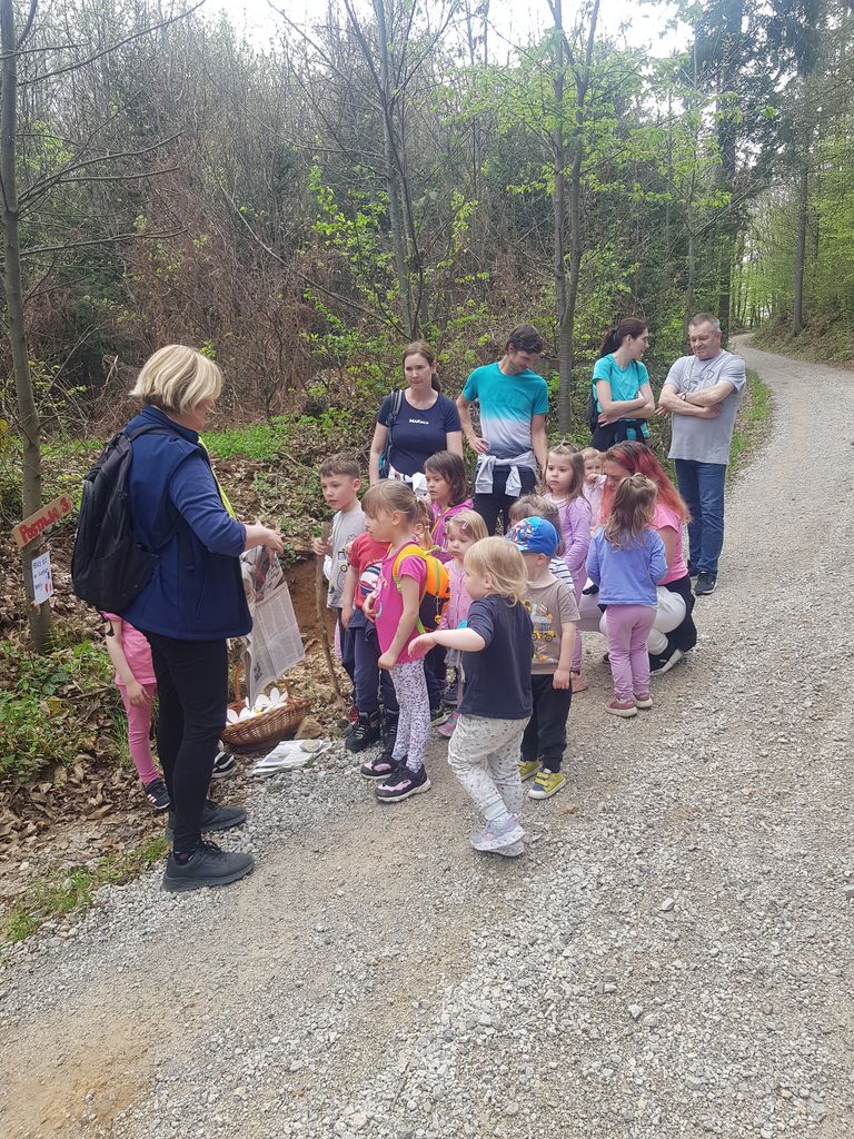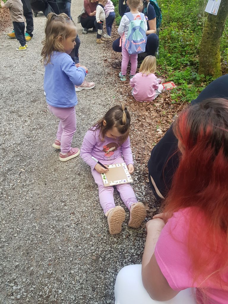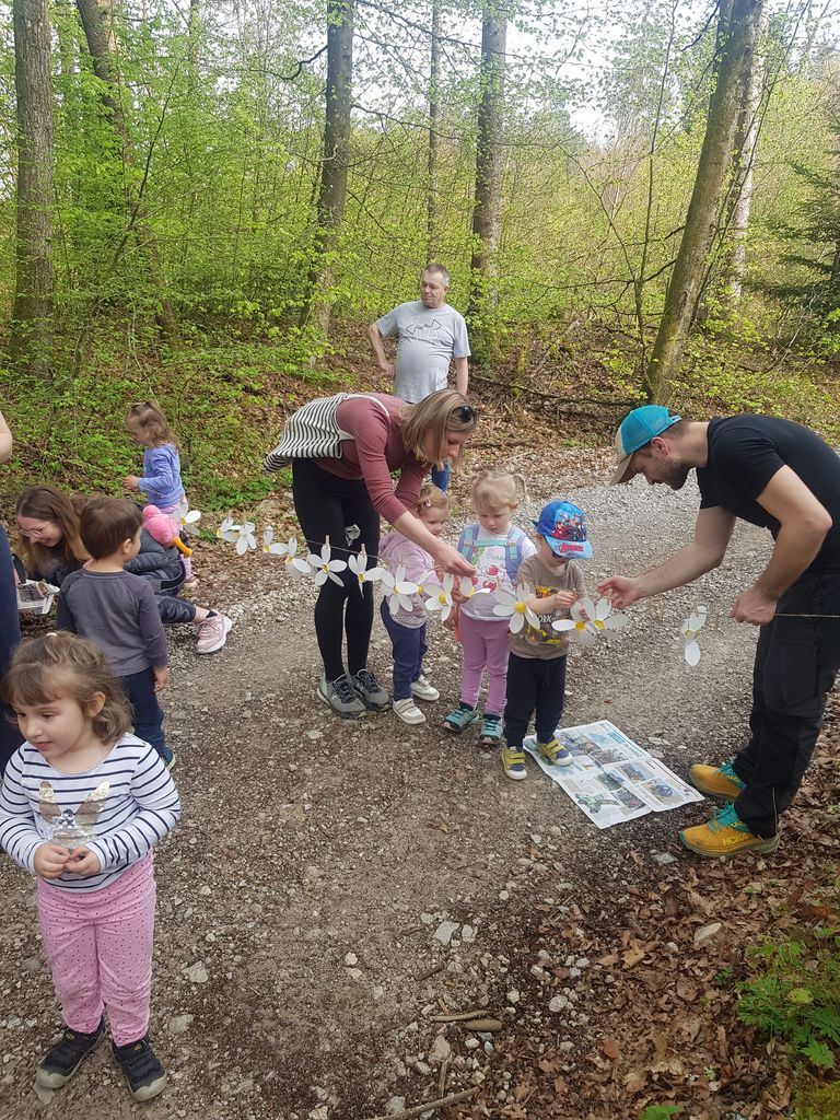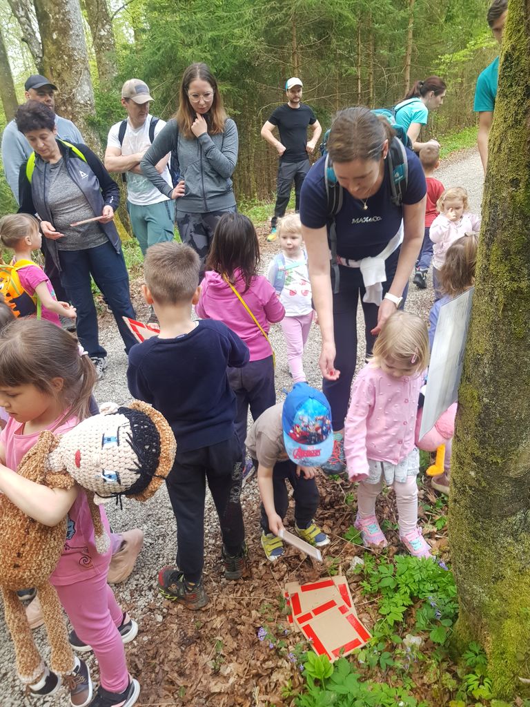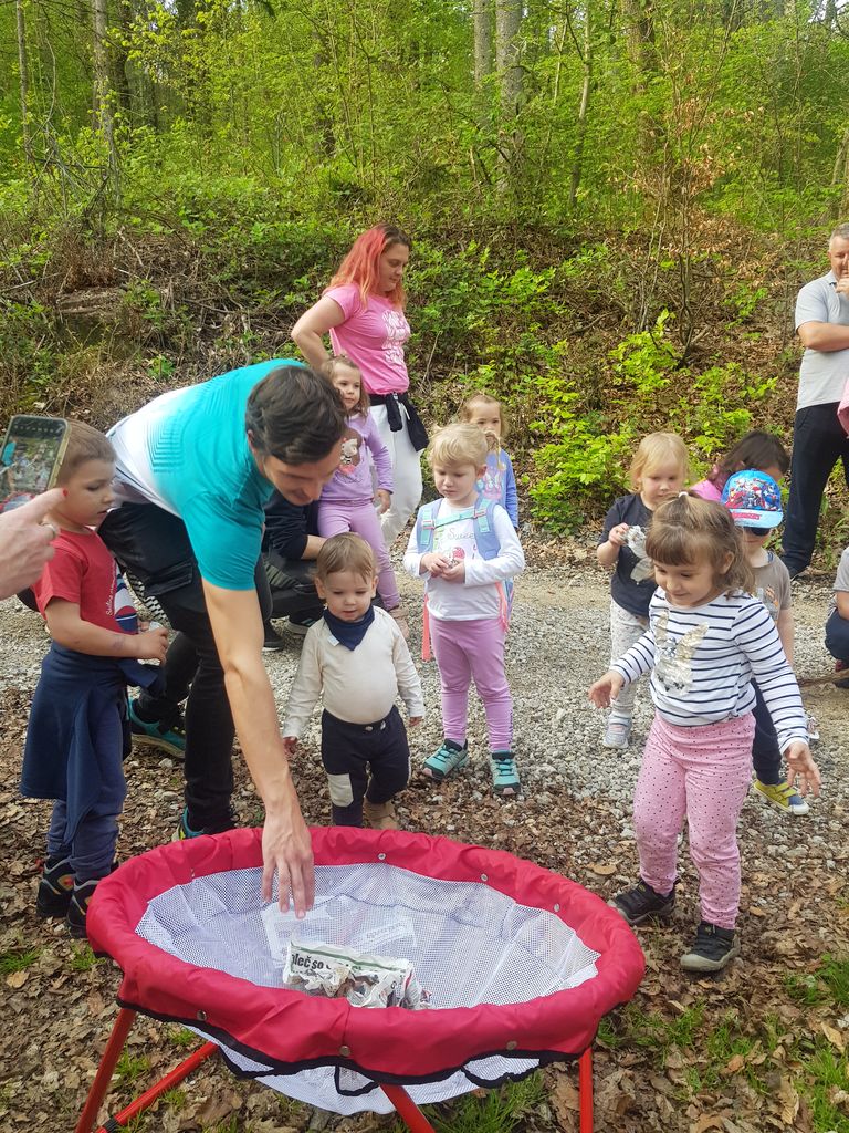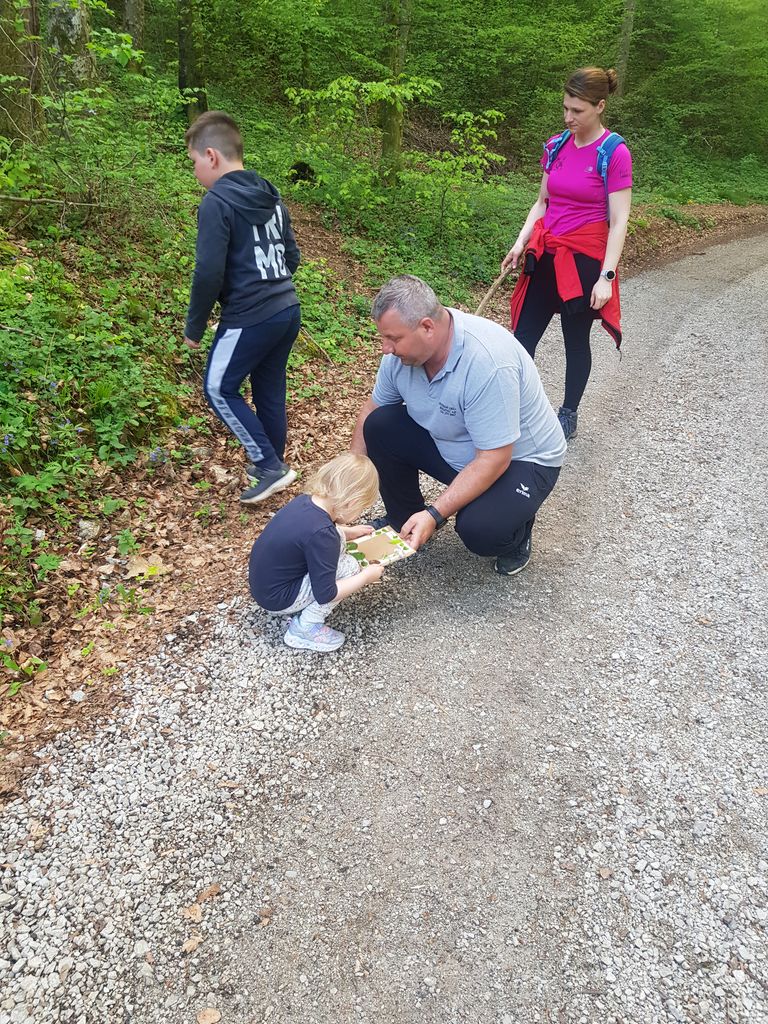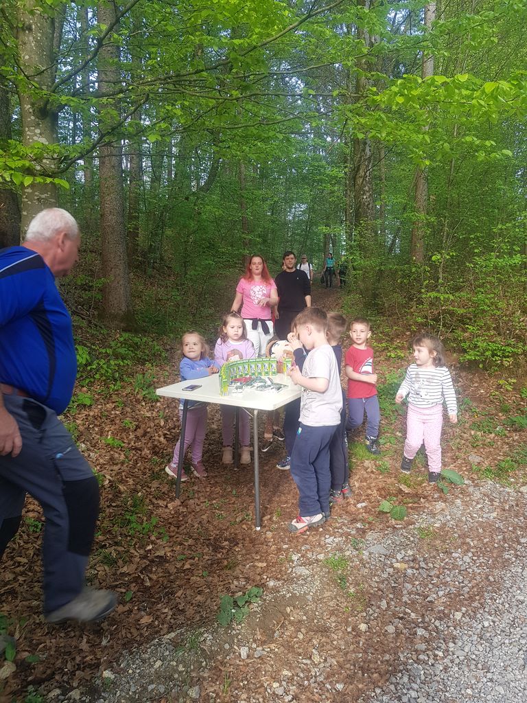 Po pozdravu smo se odpravili na del trim steze. Otroci so bili hoje po gozdu zelo veseli in so komaj čakali na postavljene postaje in reševanje nalog. Po postajah so nas vodile markacije in puščice. Že na prvi postaji so pri nalogi sodelovali tudi starši, saj so morali iz svojih rok narediti lestev katero so otroci z veseljem prehodili.