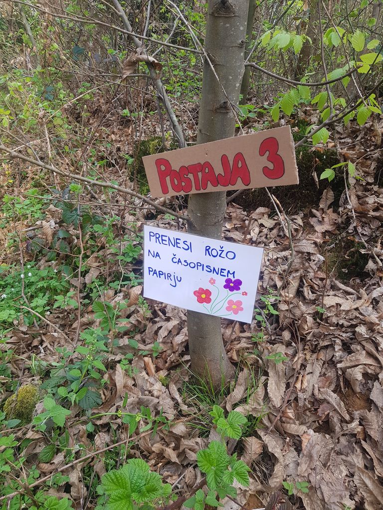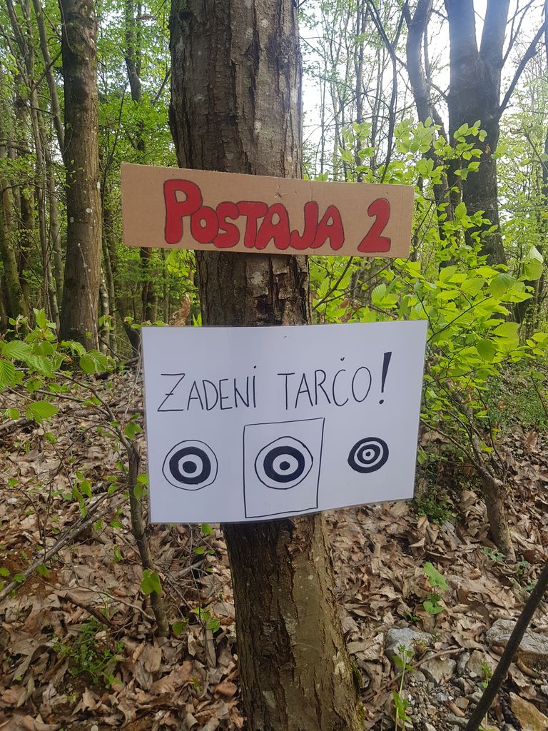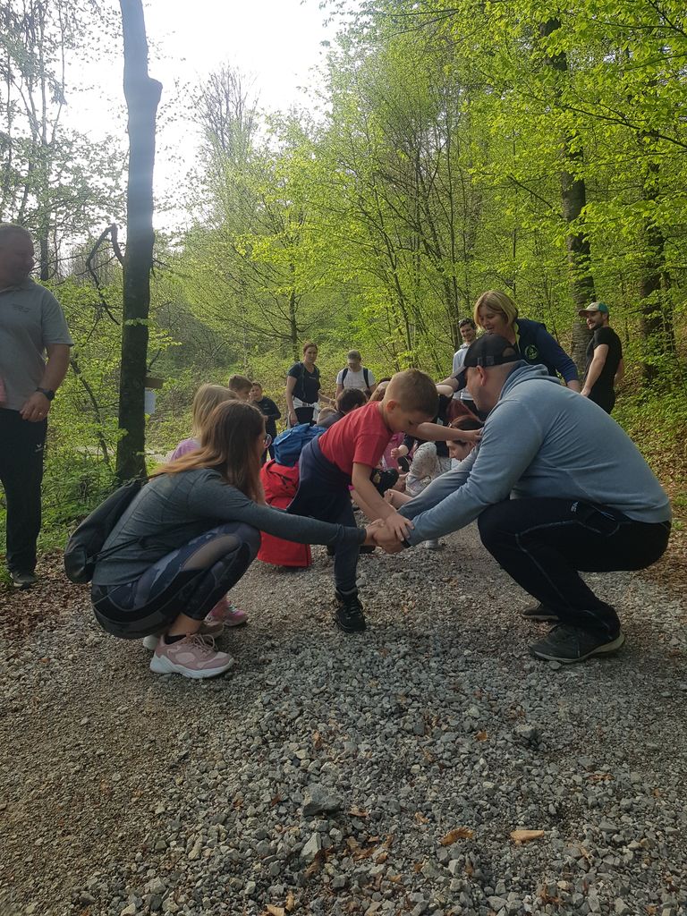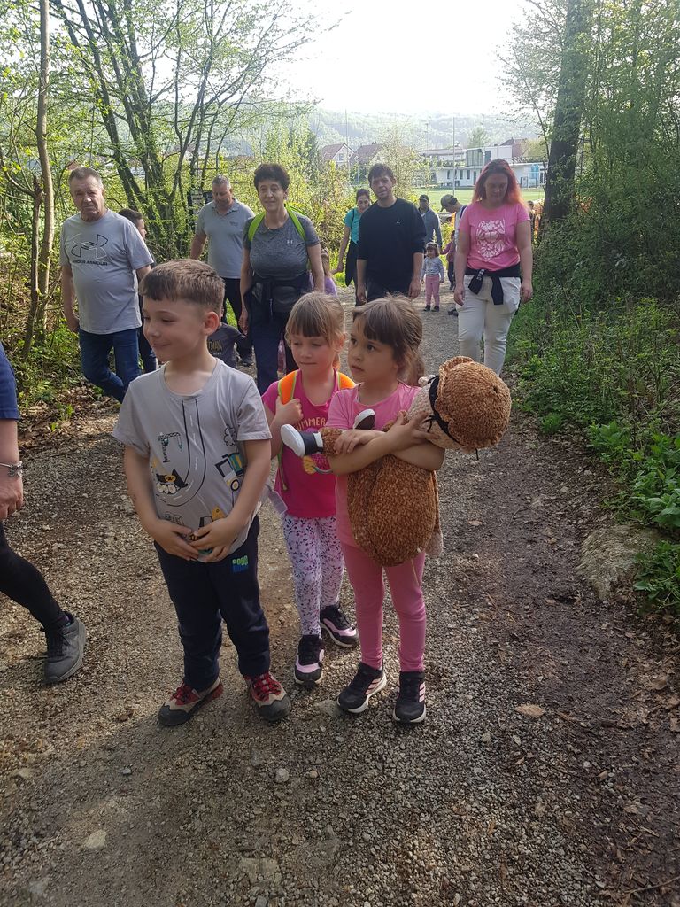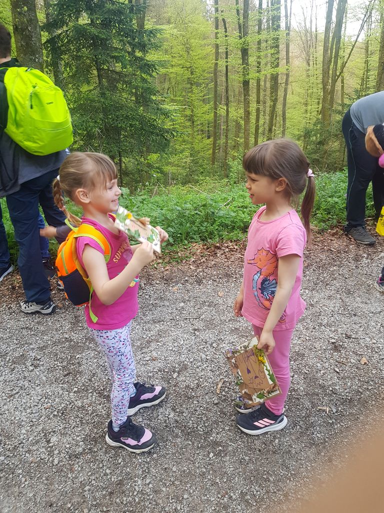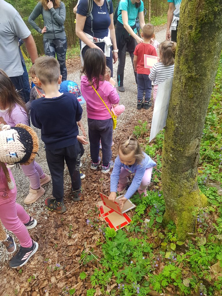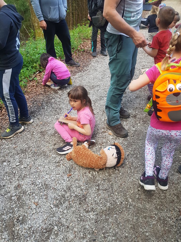 Po pozdravu smo se odpravili na del trim steze. Otroci so bili hoje po gozdu zelo veseli in so komaj čakali na postavljene postaje in reševanje nalog. Po postajah so nas vodile markacije in puščice. Že na prvi postaji so pri nalogi sodelovali tudi starši, saj so morali iz svojih rok narediti lestev katero so otroci z veseljem prehodili.