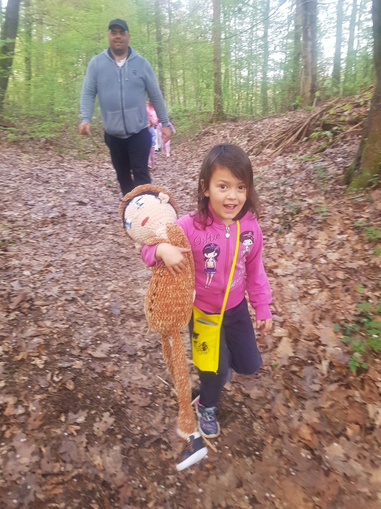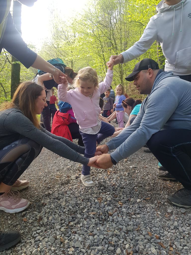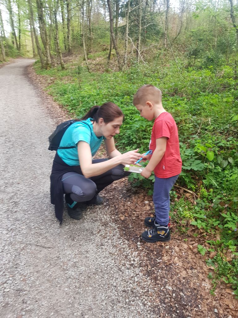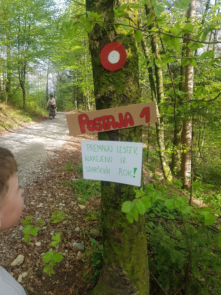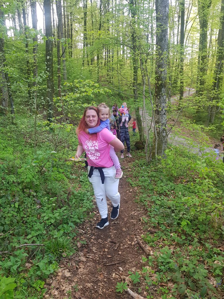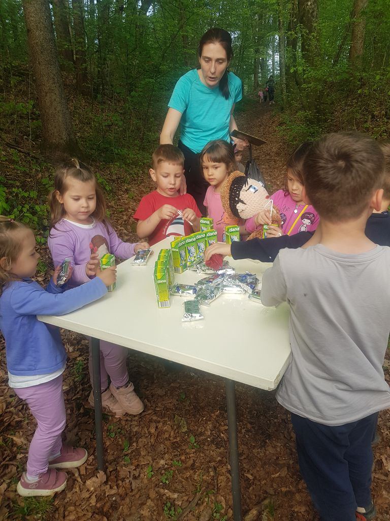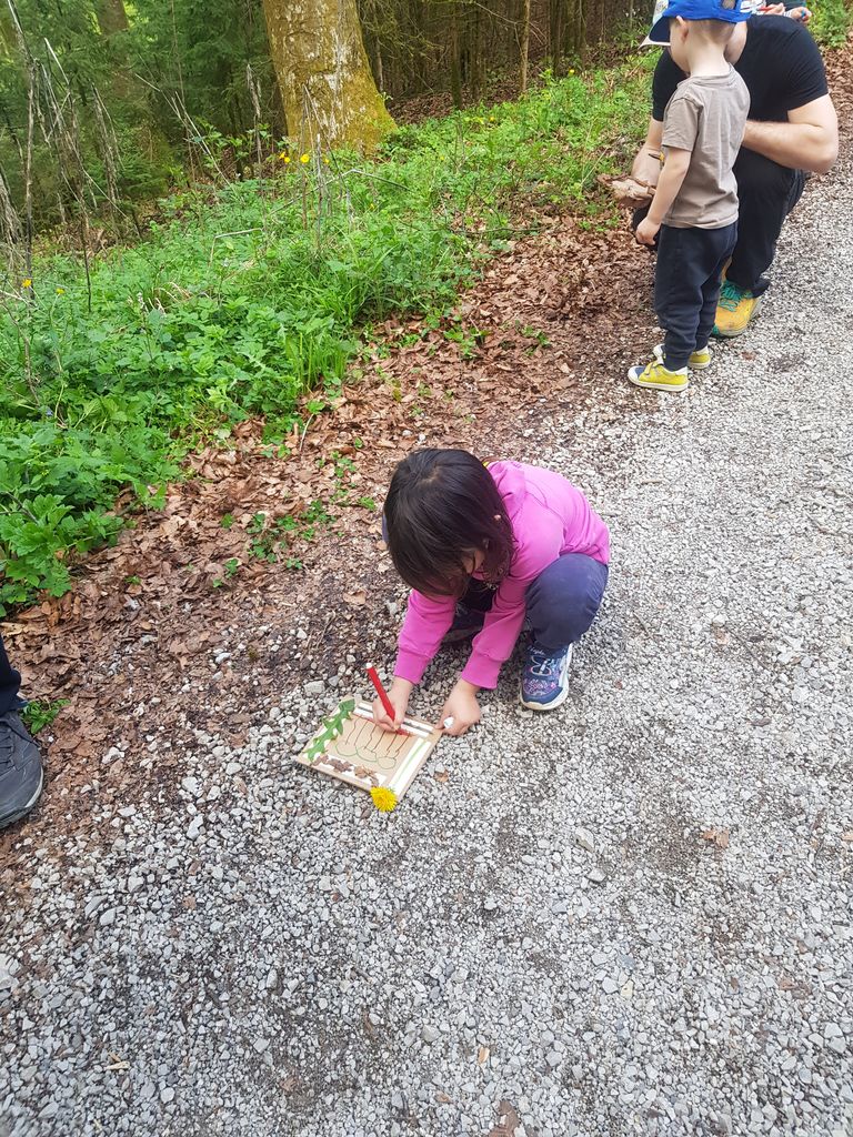 Po pozdravu smo se odpravili na del trim steze. Otroci so bili hoje po gozdu zelo veseli in so komaj čakali na postavljene postaje in reševanje nalog. Po postajah so nas vodile markacije in puščice. Že na prvi postaji so pri nalogi sodelovali tudi starši, saj so morali iz svojih rok narediti lestev katero so otroci z veseljem prehodili.