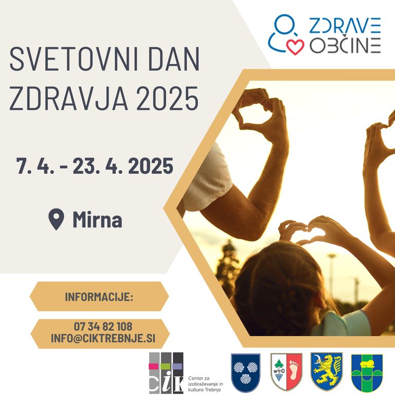 V duhu ohranjanja dobre psihofizične kondicije bomo v letu 2025 obeležili Svetovni dan zdravja. Tokrat bodo aktivnosti potekala v Občini Mirna. Vabljeni, da se nam pridružite.