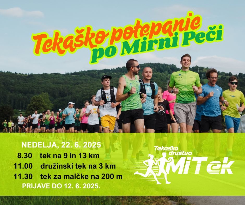 Tekaško društvo MiTek, ki treninge enkrat tedensko pripravlja tudi v Trebnjem, bo v nedeljo, 22. 6. 2025, pri Muzeju Lojzeta Slaka in Toneta Pavčka pripravilo že 5. Tekaško potepanje po Mirni Peči. Dogodek je namenjen vsem – otrokom in odraslim, družinam in posameznikom, rekreativnim tekačem in začetnikom. Izbrali boste lahko 13-, 9- ali 3-kilometrsko traso, predšolski otroci pa bodo odtekli 200-metrski krog po igrišču in si tako prislužili medaljo.