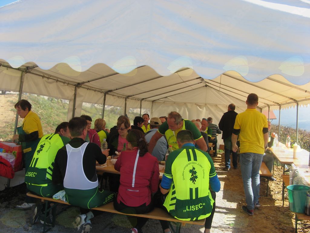 Med tem časom, ko je potekalo kolesarjenje, smo člani društva na prireditvenem prostoru na Liscu pogostili pohodnike E7-Mare Rupena ter tudi mimo idoče, ki so se vračali od zahvalne maše, ki je bila istočasno na Liscu v cerkvici Sv. Križa.